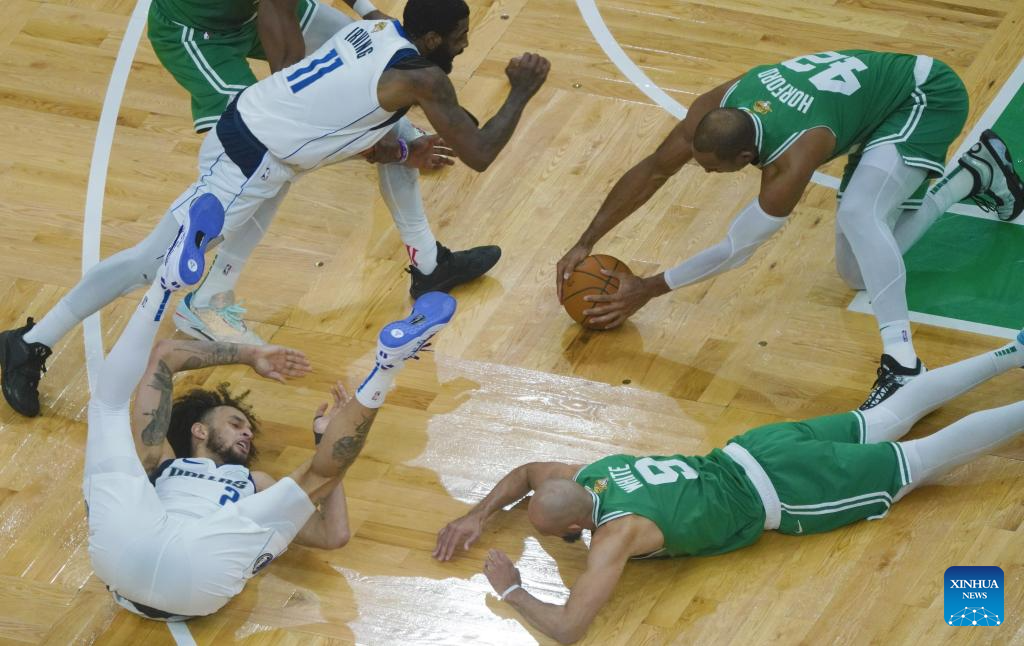 Al Horford (top R) and Derrick White (bottom R) of Boston Celtics vie against Kyrie Irving (top L) and Dereck Lively II of Dallas Mavericks during Game 5 between Boston Celtics and Dallas Mavericks at the 2023-2024 season NBA Finals in Boston, the United States, June 17, 2024. (Xinhua/Wu Xiaoling)