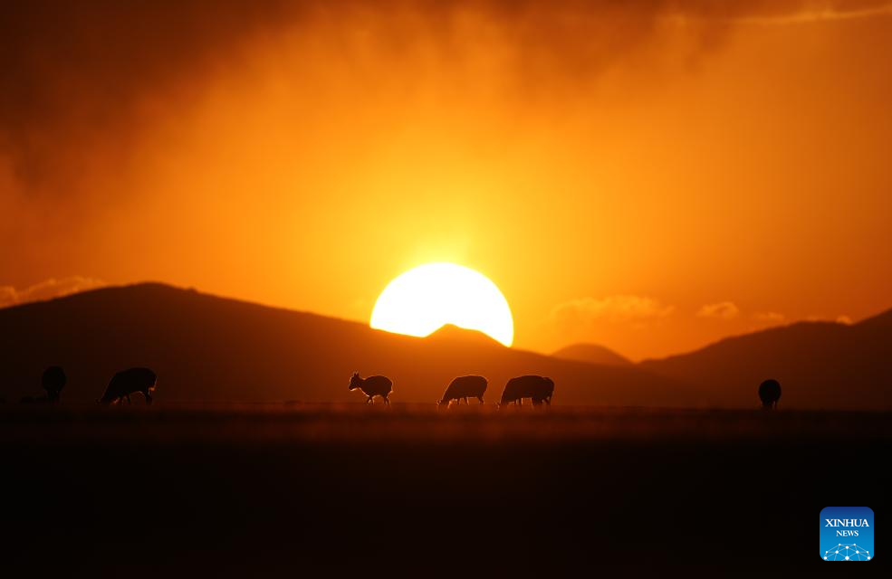 Tibetan antelopes are pictured at sunset in Qiangtang National Nature Reserve in southwest China's Xizang Autonomous Region, June 16, 2024. Tibetan antelopes, a native species in China's Qinghai-Tibet Plateau under first-class state protection, have recently embarked their birth-giving season. Their total population has exceeded 300,000, over 200,000 of which are living in Qiangtang National Nature Reserve. (Xinhua/Jigme Dorje)