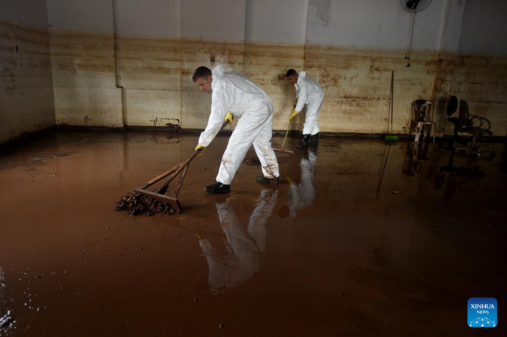 People clean up the mud in a house hit by rain-triggered floods in Porto Alegre, Rio Grande do Sul, Brazil, June 18, 2024. Continuous heavy rains in the state have killed 177 people and left 37 missing. (Photo by Lucio Tavora/Xinhua)