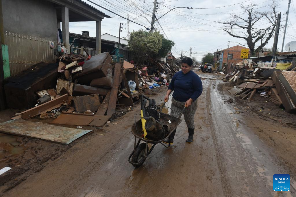 A woman pushes a wheelbarrow while walking along a street hit by rain-triggered floods in Porto Alegre, Rio Grande do Sul, Brazil, June 18, 2024. Continuous heavy rains in the state have killed 177 people and left 37 missing. (Photo by Lucio Tavora/Xinhua)