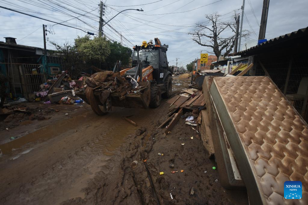 An excavator cleans the street hit by rain-triggered floods in Porto Alegre, Rio Grande do Sul, Brazil, June 18, 2024. Continuous heavy rains in the state have killed 177 people and left 37 missing. (Photo by Lucio Tavora/Xinhua)
