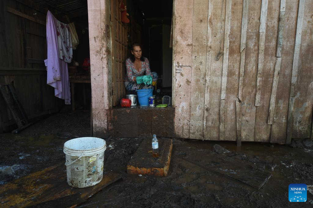 A woman cleans household utensils at home in Porto Alegre, Rio Grande do Sul, Brazil, June 18, 2024. Continuous heavy rains in the state have killed 177 people and left 37 missing. (Photo by Lucio Tavora/Xinhua)