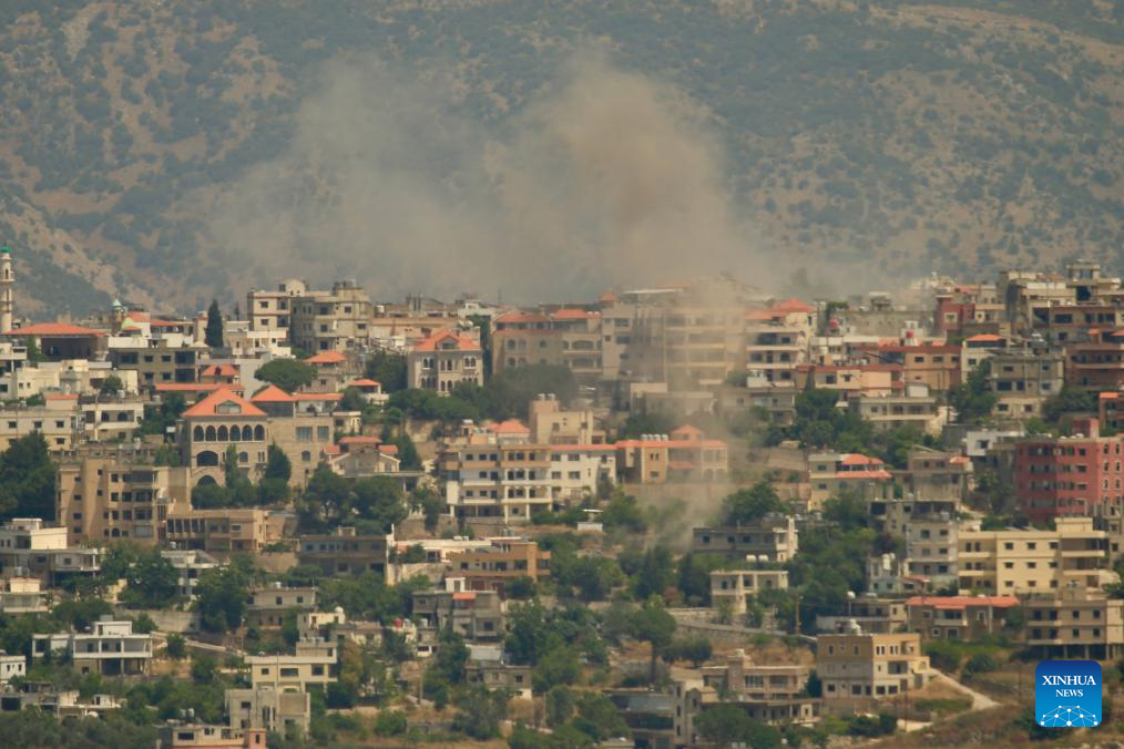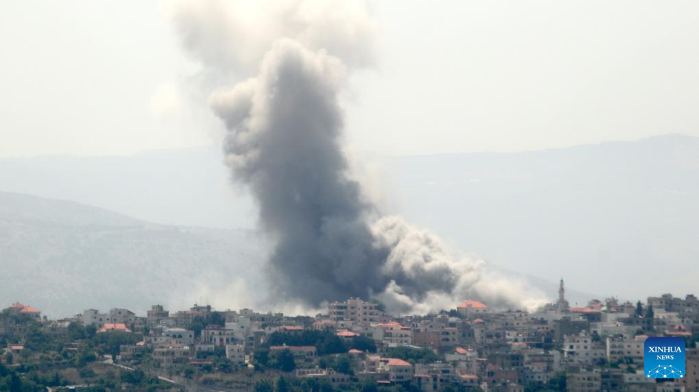This photo shows smoke caused by an Israeli strike in Yaroun village in southern Lebanon on June 19, 2024. Three Hezbollah members, including a local official, were killed and four civilians wounded on Wednesday in Israeli air strikes on Lebanese villages, Lebanese military sources told Xinhua.