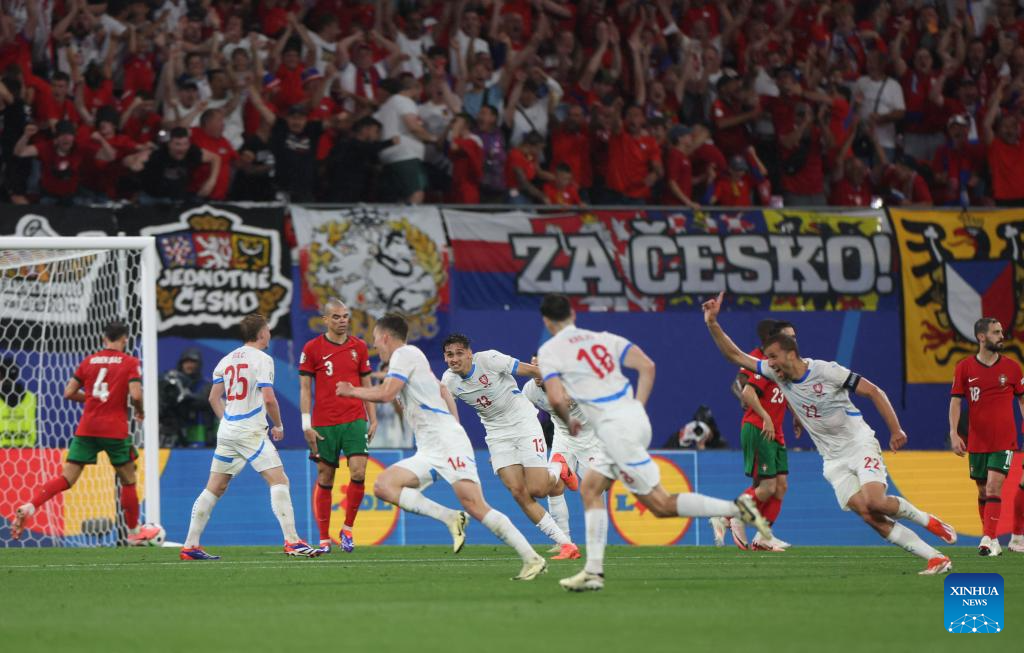 Lukas Provod (4th L) of the Czech Republic celebrates his goal during the UEFA Euro 2024 Group F match between Portugal and the Czech Republic in Leipzig, Germany on June 18, 2024. (Xinhua/Bai Xuefei)