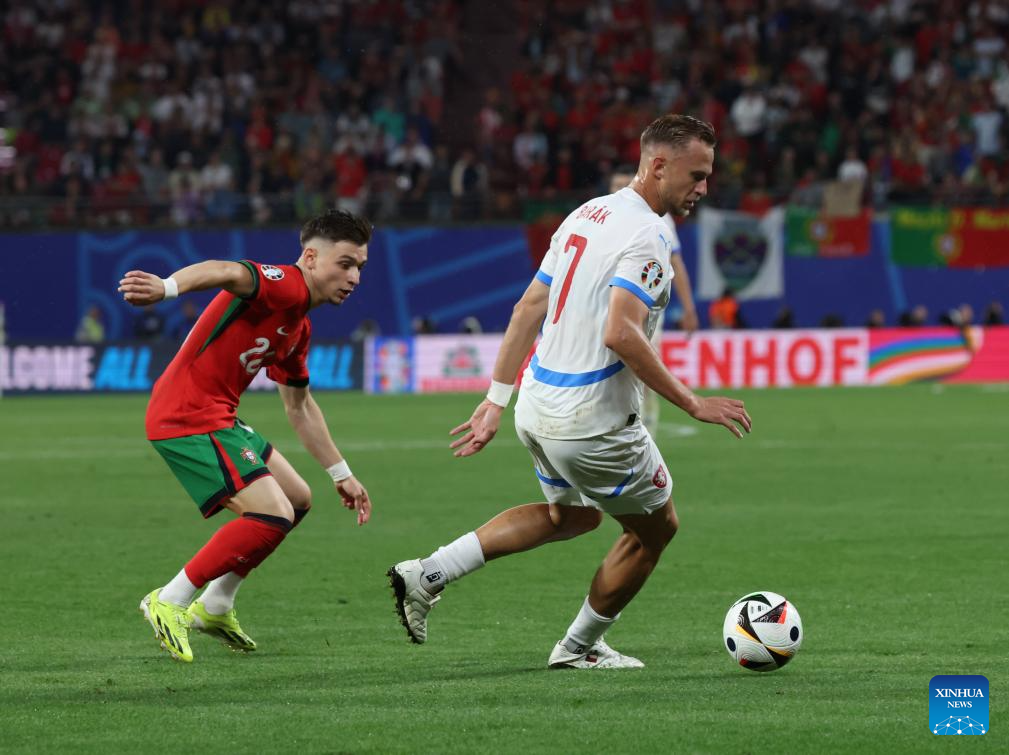 Francisco Conceicao (L) of Portugal vies with Antonin Barak of the Czech Republic during the UEFA Euro 2024 Group F match between Portugal and the Czech Republic in Leipzig, Germany on June 18, 2024. (Xinhua/Zhang Fan)