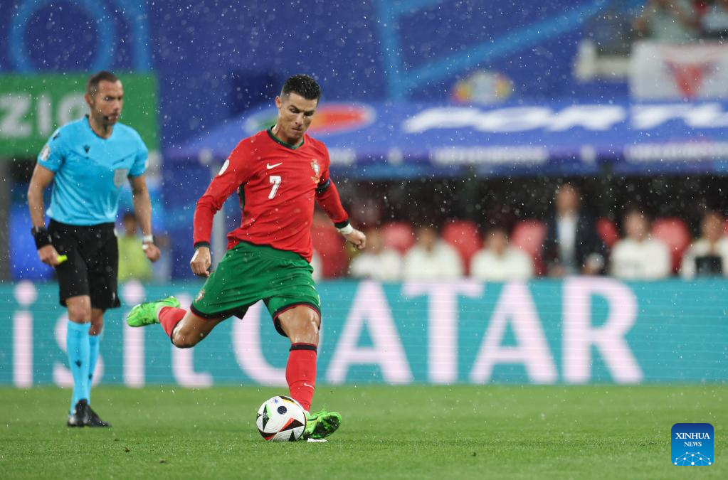 Cristiano Ronaldo of Portugal shoots the ball during the UEFA Euro 2024 Group F match between Portugal and the Czech Republic in Leipzig, Germany on June 18, 2024. (Xinhua/Bai Xuefei)