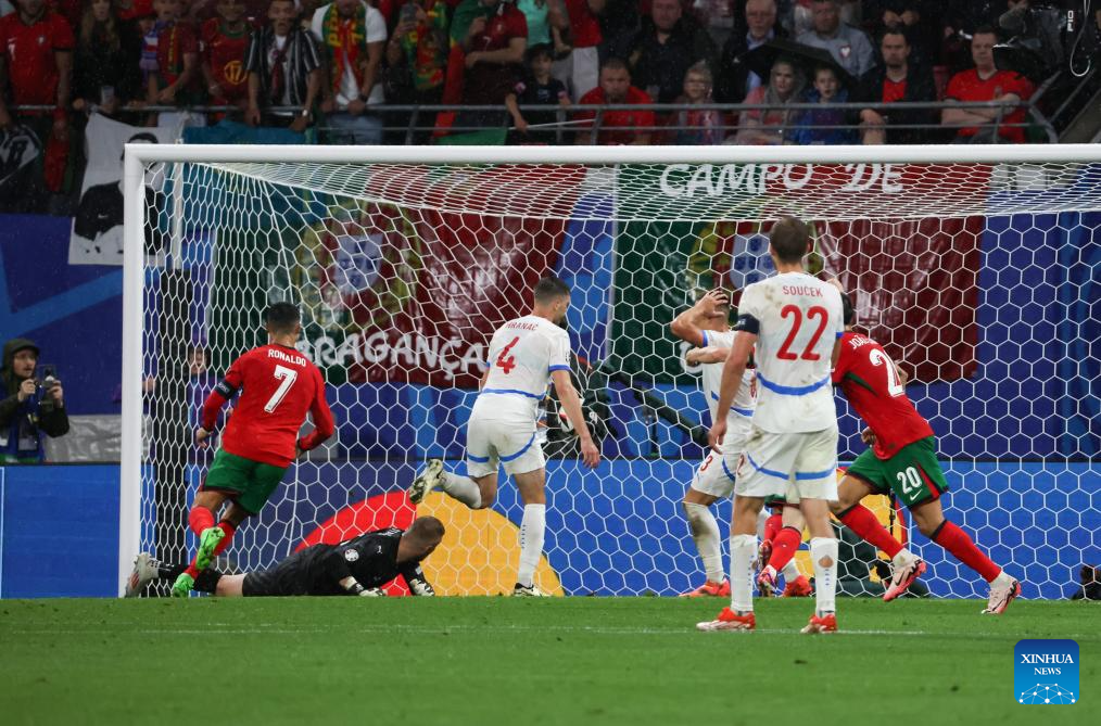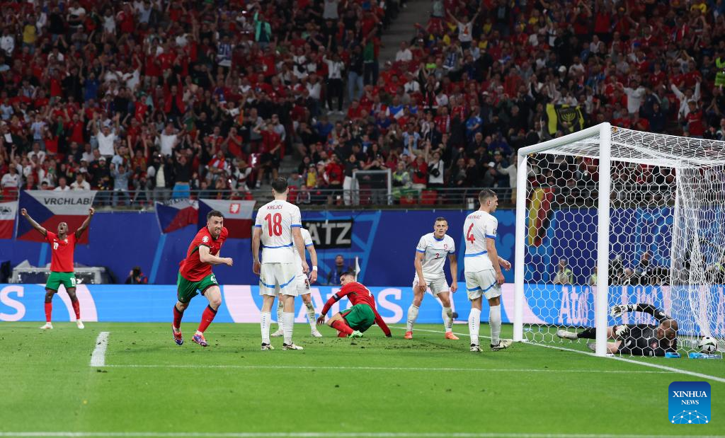 Players of Portugal celebrate a goal during the UEFA Euro 2024 Group F match between Portugal and the Czech Republic in Leipzig, Germany on June 18, 2024. (Xinhua/Bai Xuefei)
