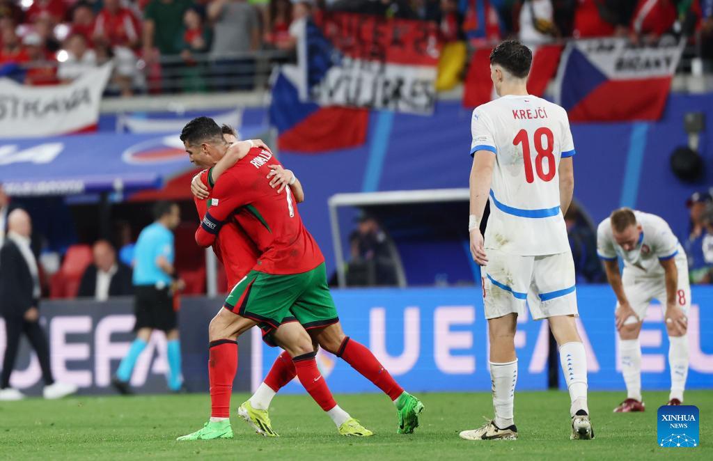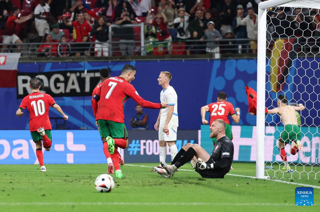 Cristiano Ronaldo (3rd L) of Portugal celebrates with teammates after the UEFA Euro 2024 Group F match between Portugal and the Czech Republic in Leipzig, Germany on June 18, 2024. (Xinhua/Zhang Fan)