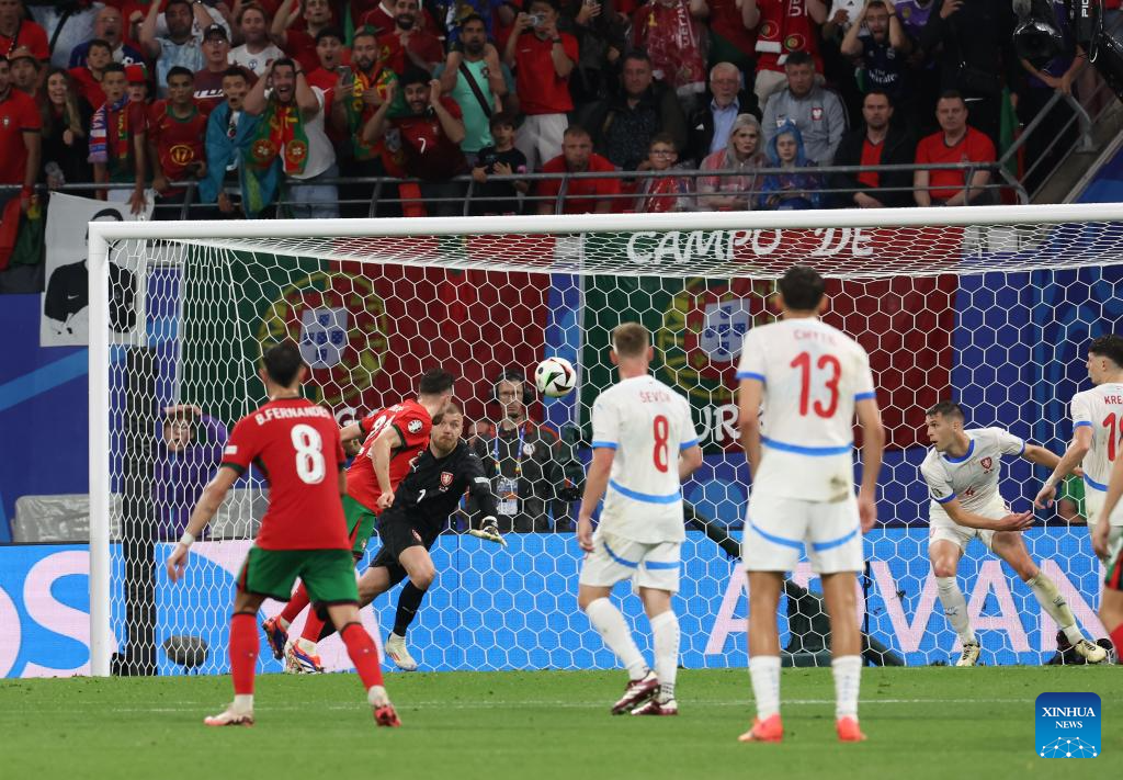 Robin Hranac (3rd, L) of the Czech Republic makes an own goal during the UEFA Euro 2024 Group F match between Portugal and the Czech Republic in Leipzig, Germany on June 18, 2024. (Xinhua/Zhang Fan)