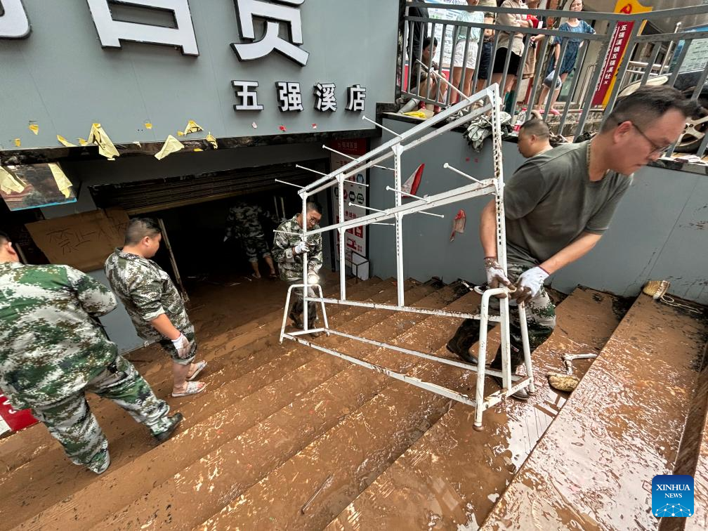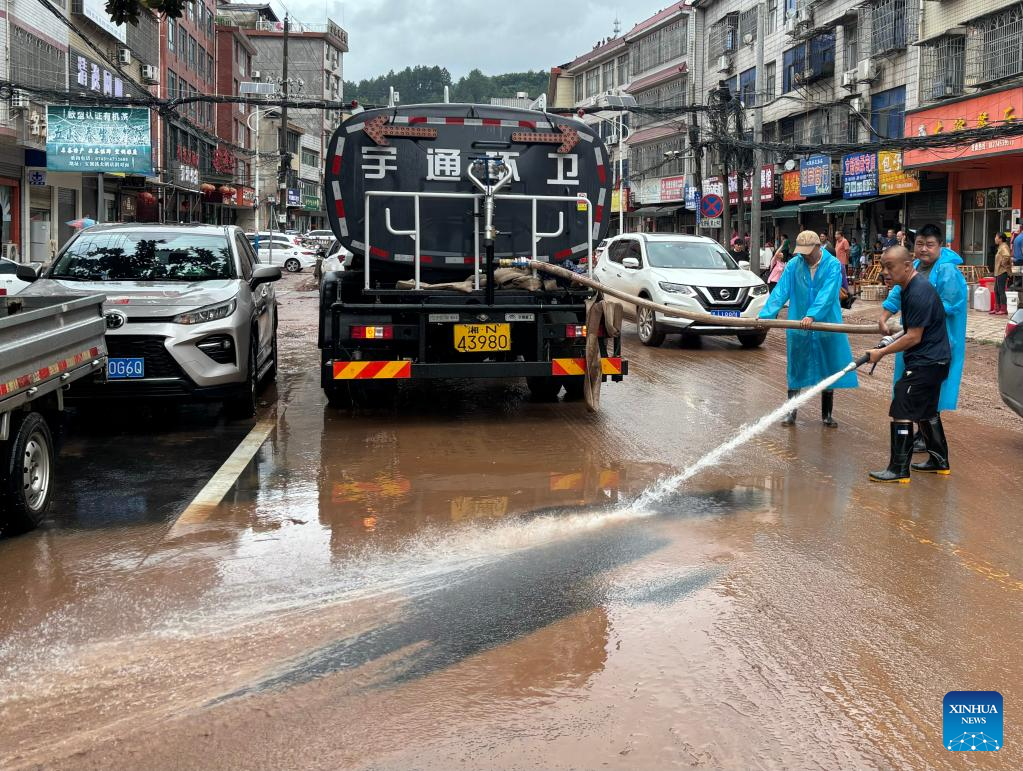 This photo taken by a mobile phone on June 23, 2024 shows people cleaning the mud on a road in Wuqiangxi Township of Yuanling County in central China's Hunan Province. Heavy rainfall hit Wuqiangxi Township on Saturday, triggering flood that impacted local residential area. Local authorities have carried out emergency response to minimize the impact of the extreme weather conditions. (Xinhua/Yu Chunsheng)