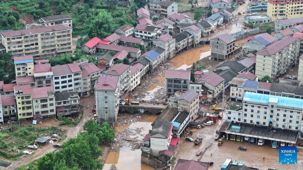 An aerial drone photo taken on June 23, 2024 shows Wuqiangxi Township of Yuanling County in central China's Hunan Province. Heavy rainfall hit Wuqiangxi Township on Saturday, triggering flood that impacted local residential area. Local authorities have carried out emergency response to minimize the impact of the extreme weather conditions. (Photo by Wang Sheng/Xinhua)