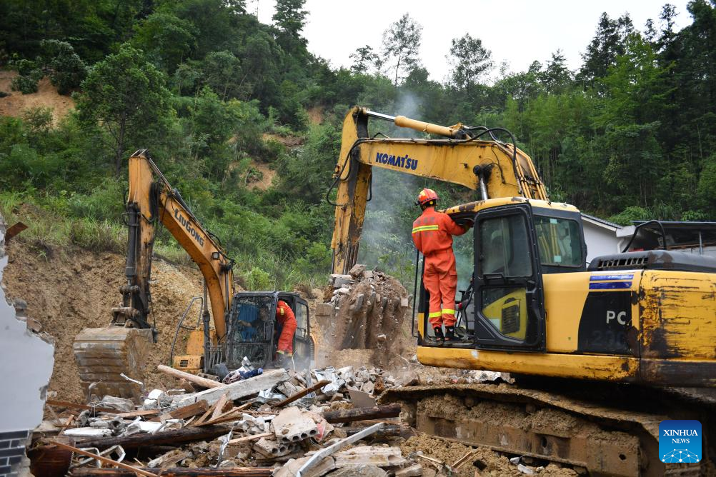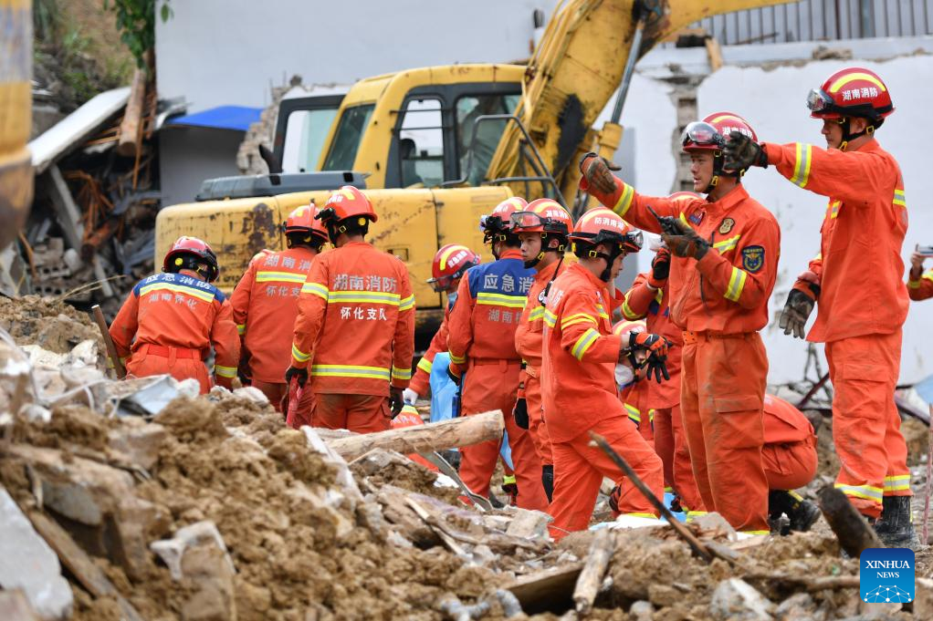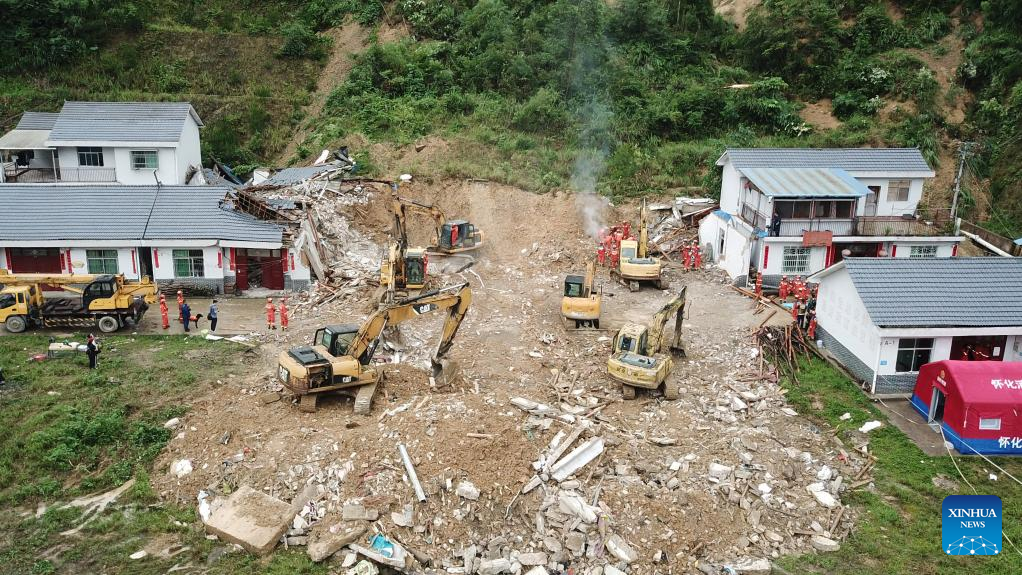 Rescuers work at the site of a landslide in Douxi Village, Xinhuang Dong Autonomous County of Huaihua City, central China's Hunan Province, June 23, 2024. The landslide occurred in Douxi Village at 4:30 a.m. on Sunday causing the collapse of four houses. The eight residents previously reported as missing have all been confirmed dead. (Xinhua/Chen Zhenhai)