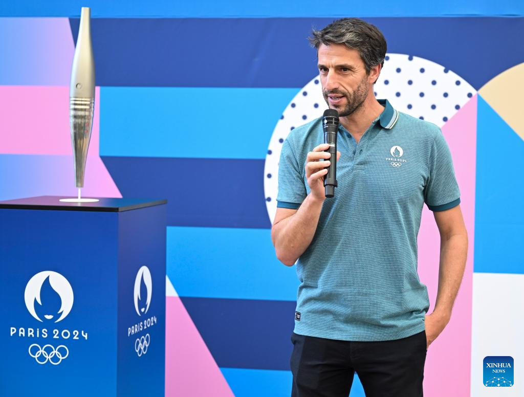 Tony Estanguet, president of the Paris 2024 Olympics and Paralympics Organizing Committee, talks to media before the inauguration of the Paris 2024 Megastore at the Champs Elysee avenue in Paris, France, June 27, 2024. (Xinhua/He Changshan)