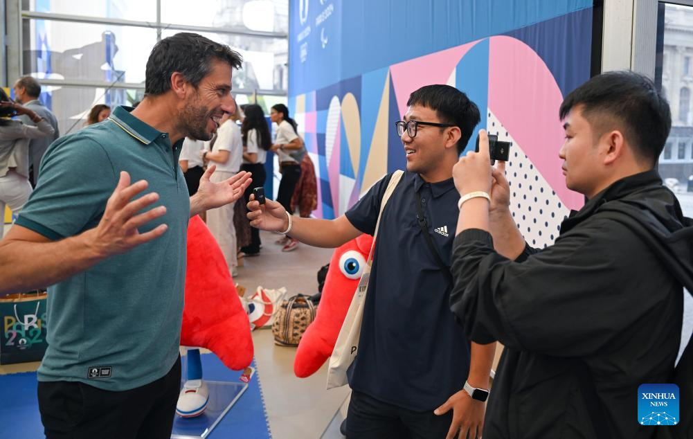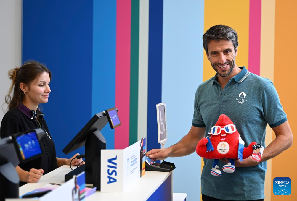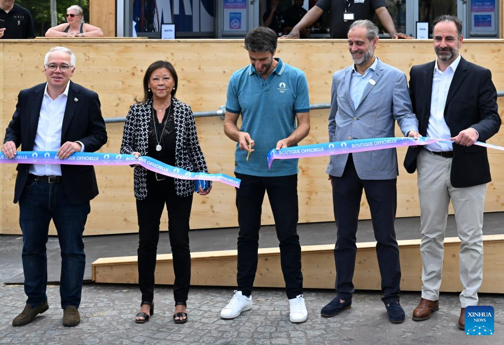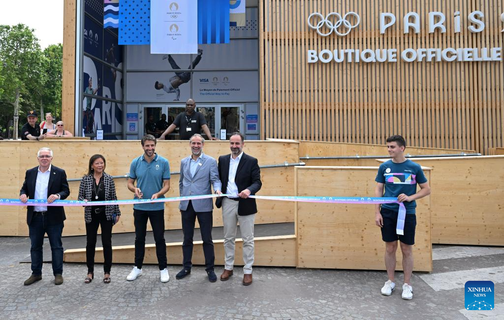 Tony Estanguet (2nd R), president of the Paris 2024 Olympics and Paralympics Organizing Committee, visit the megastore before the inauguration of the Paris 2024 Megastore at the Champs Elysee avenue in Paris, France, June 27, 2024. (Xinhua/He Changshan)
