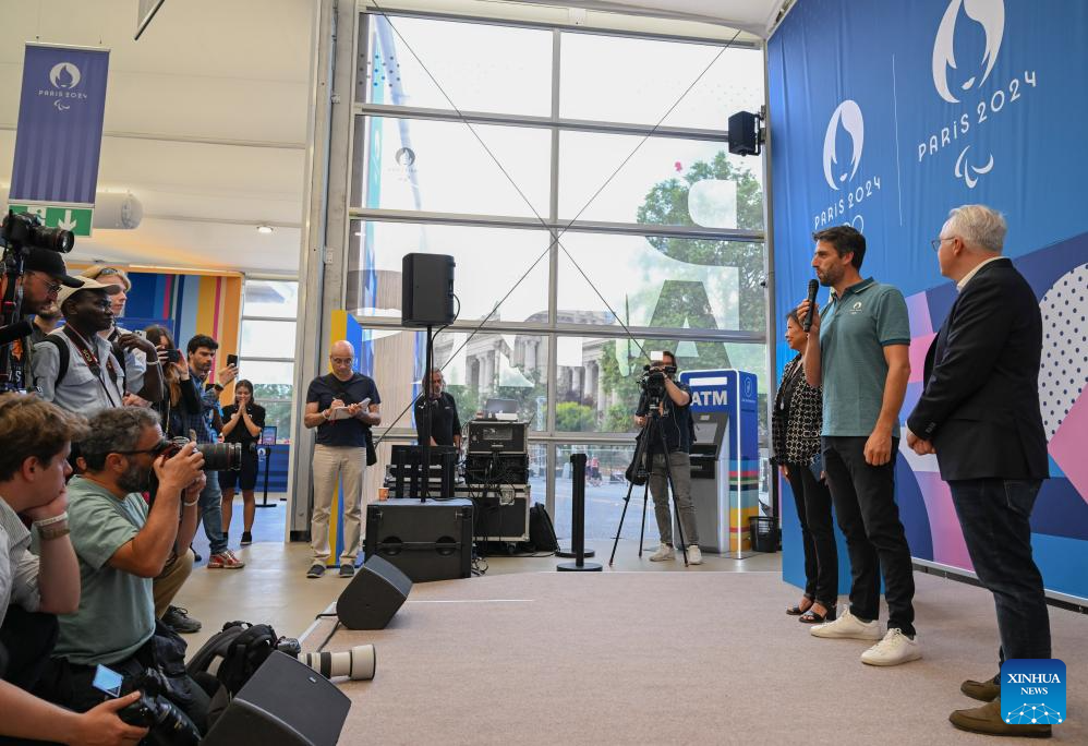Tony Estanguet (2nd R), president of the Paris 2024 Olympics and Paralympics Organizing Committee, talks to media before the inauguration of the Paris 2024 Megastore at the Champs Elysee avenue in Paris, France, June 27, 2024. (Xinhua/He Changshan)