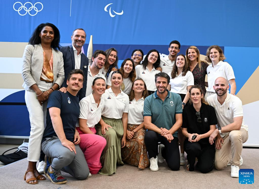 Tony Estanguet (front 3rd R), president of the Paris 2024 Olympics and Paralympics Organizing Committee, poses with staff in the Paris 2024 megastore after the inauguration of the Paris 2024 Megastore at the Champs Elysee avenue in Paris, France, June 27, 2024. (Xinhua/He Changshan)