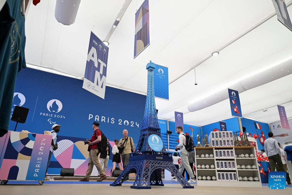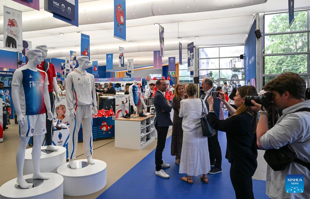 Photo taken on June 27, 2024 shows the inner view of the Paris 2024 official store on the Champs-Elysees Avenue in Paris, France. (Xinhua/He Changshan)