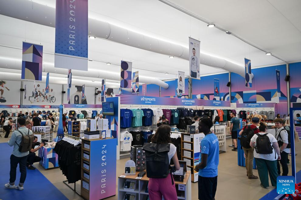 Customers purchase goods at the Paris 2024 official store on the Champs-Elysees Avenue in Paris, France, June 27, 2024. (Xinhua/He Changshan)