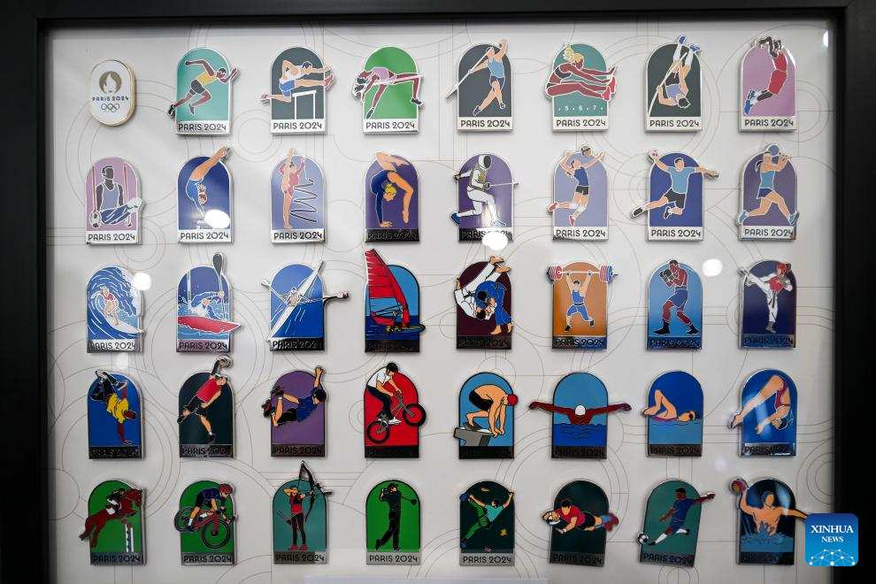 Photo taken on June 27, 2024 shows the Olympic badges in the Paris 2024 official store on the Champs-Elysees Avenue in Paris, France. (Xinhua/He Changshan)
