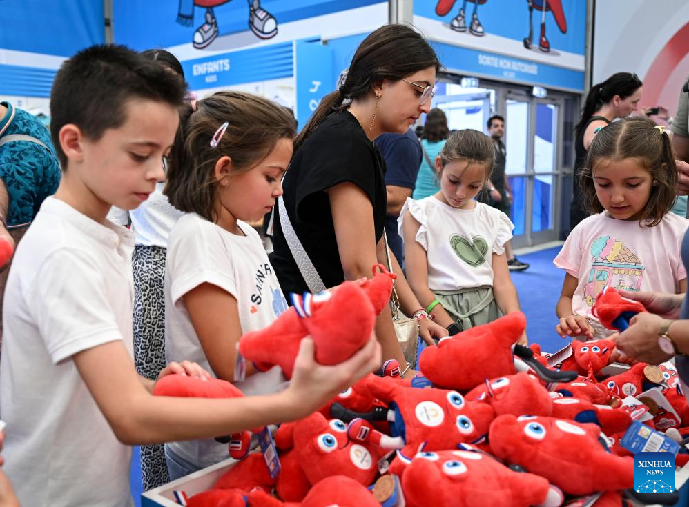 Customers purchase products of the Olympic Phryges mascots in the Paris 2024 official store on the Champs-Elysees Avenue in Paris, France, June 27, 2024. (Xinhua/He Changshan)