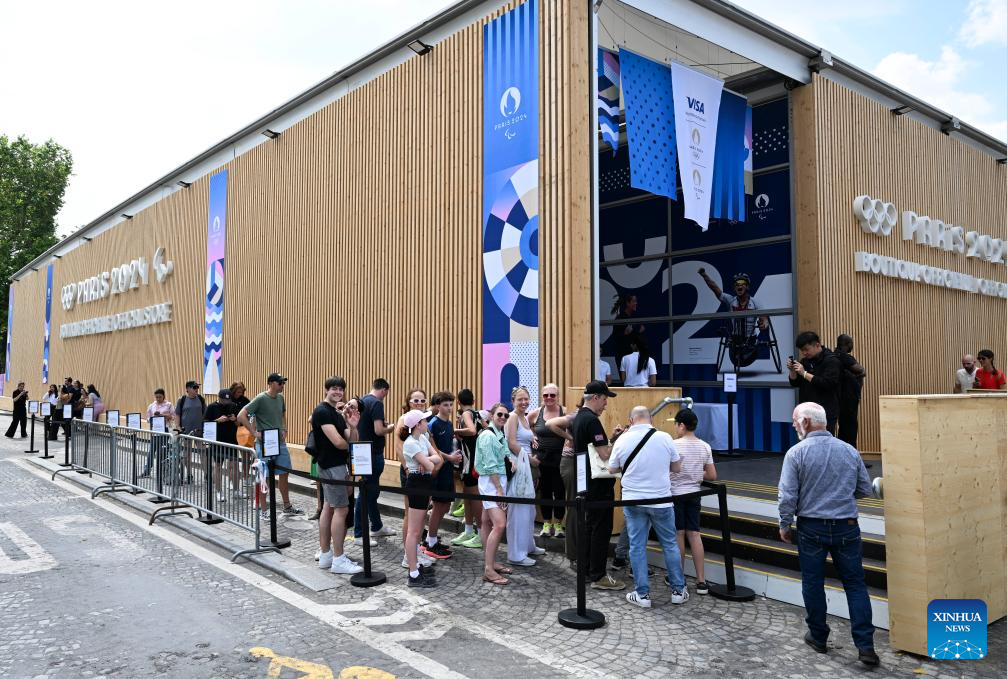 Customers line up outside the Paris 2024 official store on the Champs-Elysees Avenue in Paris, France, June 27, 2024. (Xinhua/He Changshan)