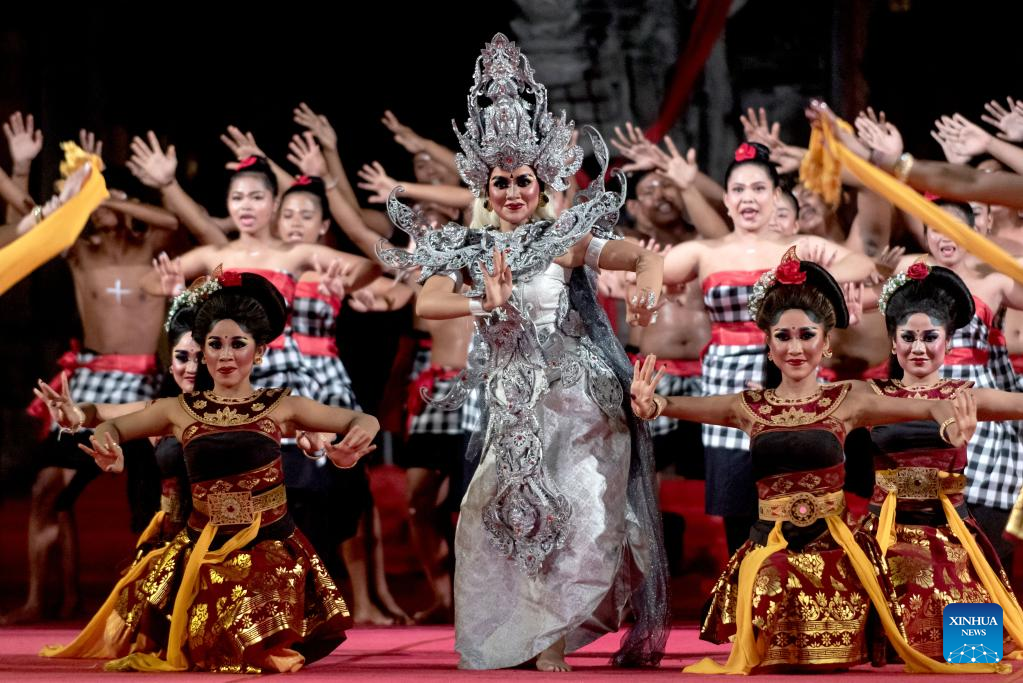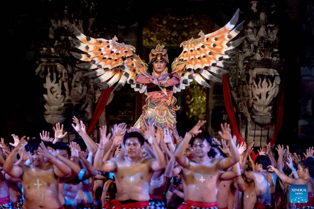 Dancers perform Kecak Dance during the Bali Arts Festival 2024 at Garuda Wisnu Kencana Cultural Park in Bali, Indonesia, June 30, 2024. This year's Bali Arts Festival is held from June 15 to July 13. (Photo by Dicky Bisinglasi/Xinhua)