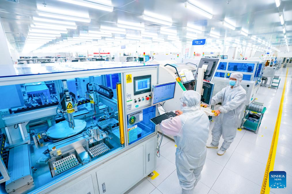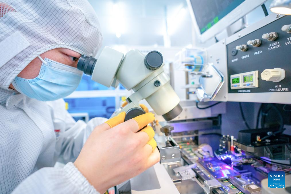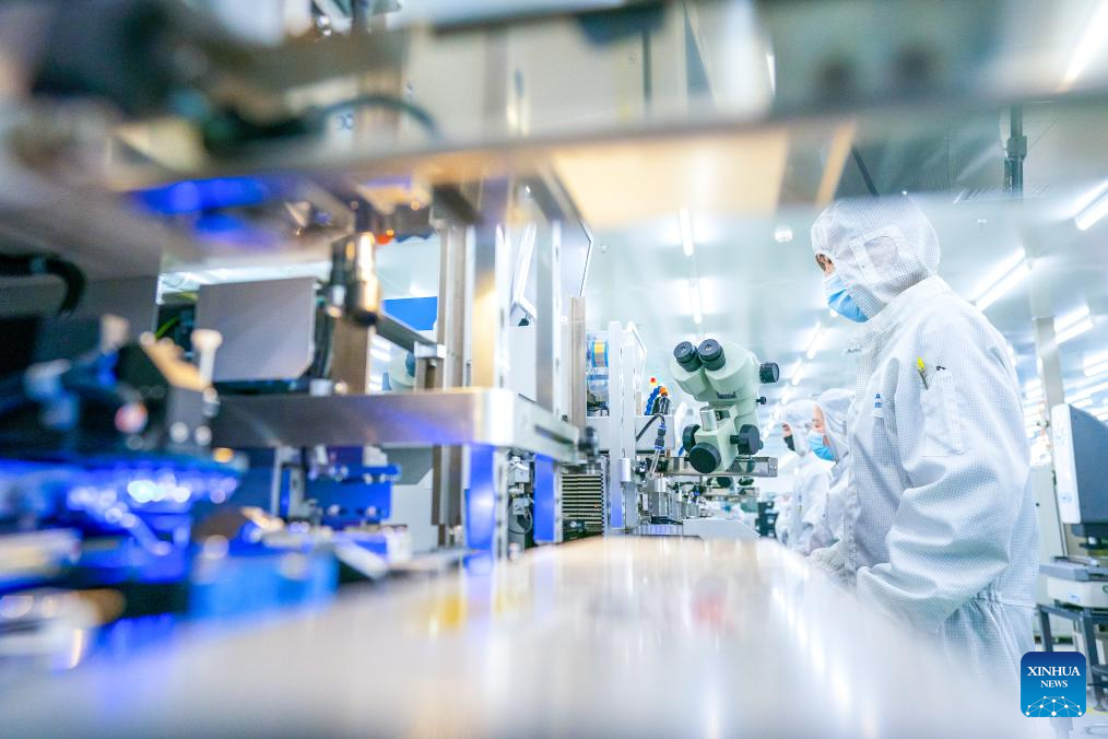 Staff members work on a production line of Accelink Technologies, an opto-electronic components supplier, in Wuhan, central China's Hubei Province, Feb. 5, 2024. Wuhan East Lake High-tech Development Zone, also known as the optics valley of China, is the birthplace of China's first optical fiber and a national optoelectronic information industry base. In recent years, Hubei Province has made major breakthroughs in the development of optoelectronic information industry and accelerated the building of optoelectronic information industry clusters. (Xinhua/Xiao Yijiu)