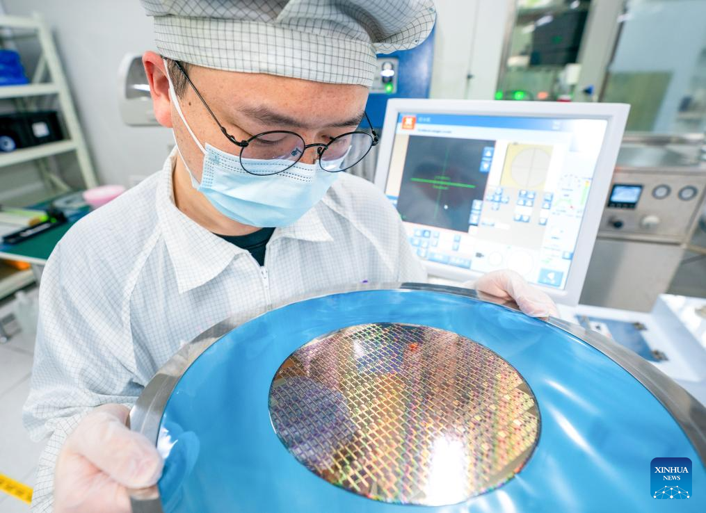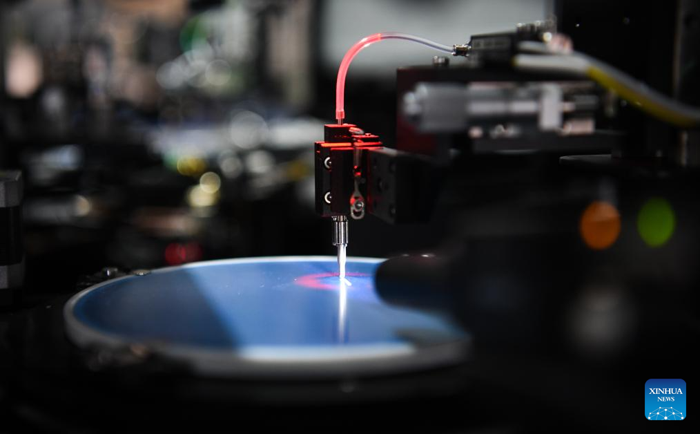 This photo taken on June 3, 2024 shows a chip testing equipment in Wuhan Precise Electronics Co., Ltd., in Wuhan, central China's Hubei Province. Wuhan East Lake High-tech Development Zone, also known as the optics valley of China, is the birthplace of China's first optical fiber and a national optoelectronic information industry base. In recent years, Hubei Province has made major breakthroughs in the development of optoelectronic information industry and accelerated the building of optoelectronic information industry clusters. (Xinhua/Du Zixuan)