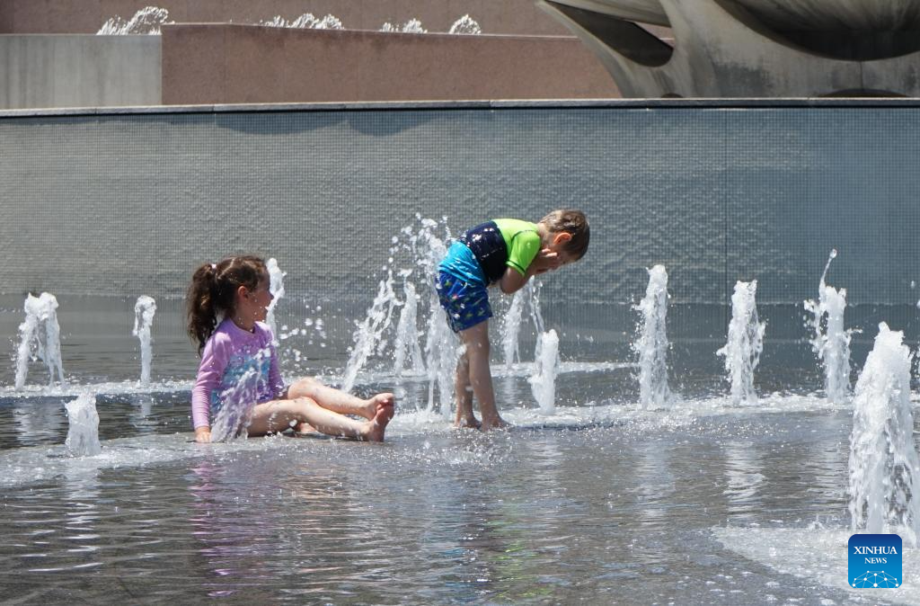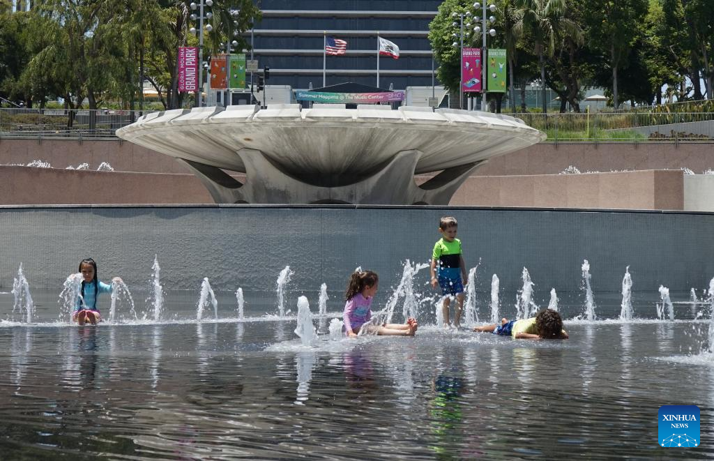 Children cool off at a fountain in Los Angeles, California, the United States, on July 5, 2024. The U.S. National Weather Service warned on Thursday that "a significant and extremely dangerous heatwave is set to build throughout the West to end this week and into the extended holiday weekend, with several days of record-breaking heat forecast." (Photo by Zeng Hui/Xinhua)