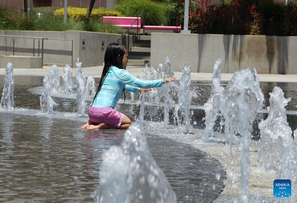 A girl cools off at a fountain in Los Angeles, California, the United States, on July 5, 2024. The U.S. National Weather Service warned on Thursday that "a significant and extremely dangerous heatwave is set to build throughout the West to end this week and into the extended holiday weekend, with several days of record-breaking heat forecast." (Photo by Zeng Hui/Xinhua)