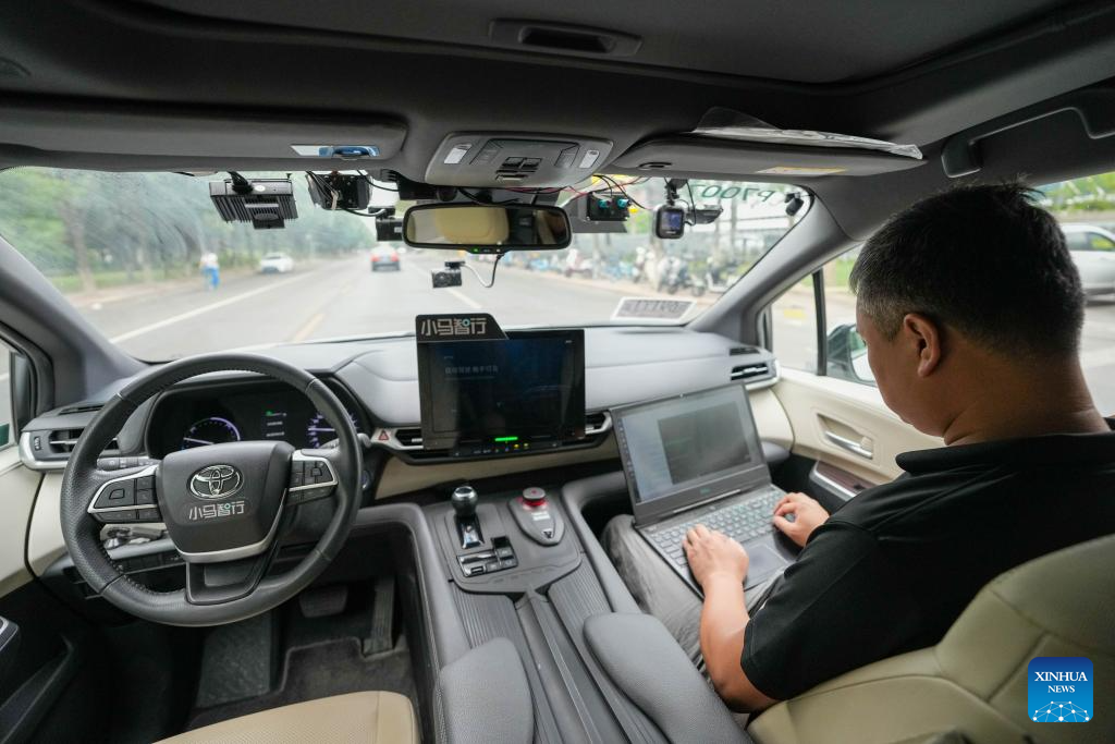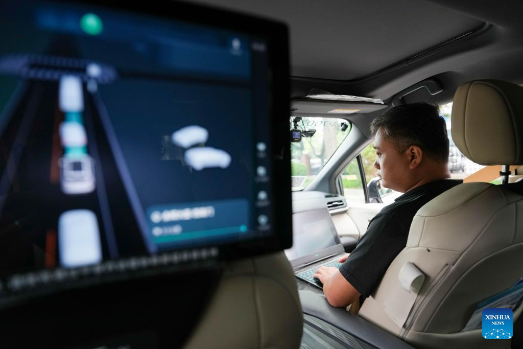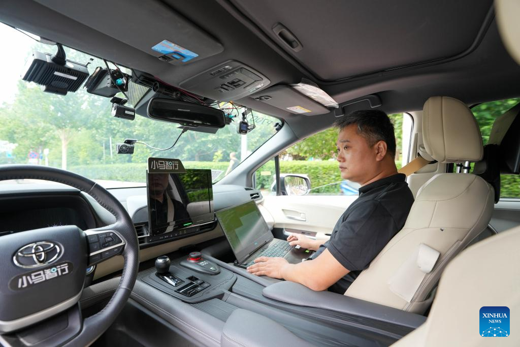 Wang Wei conducts road testing for an autonomous vehicle at an autonomous driving demonstration area in Yizhuang in Beijing, capital of China, June 19, 2024.