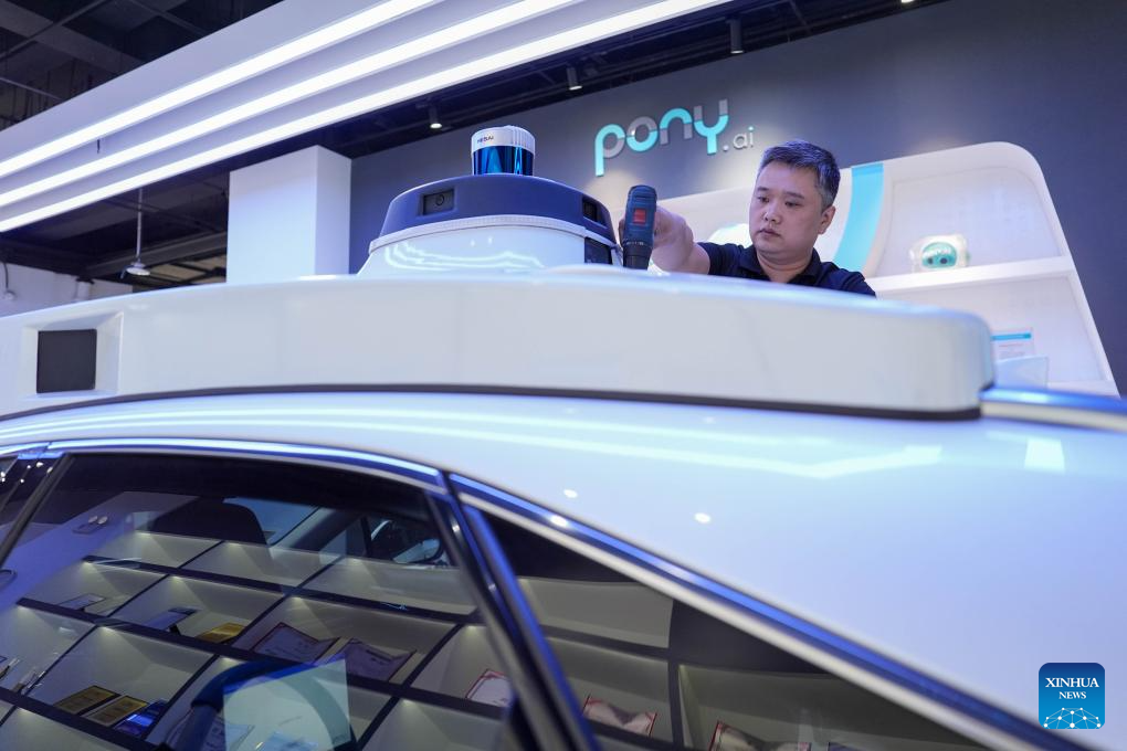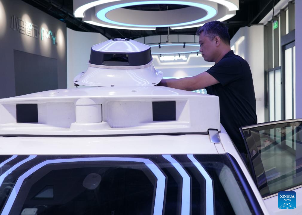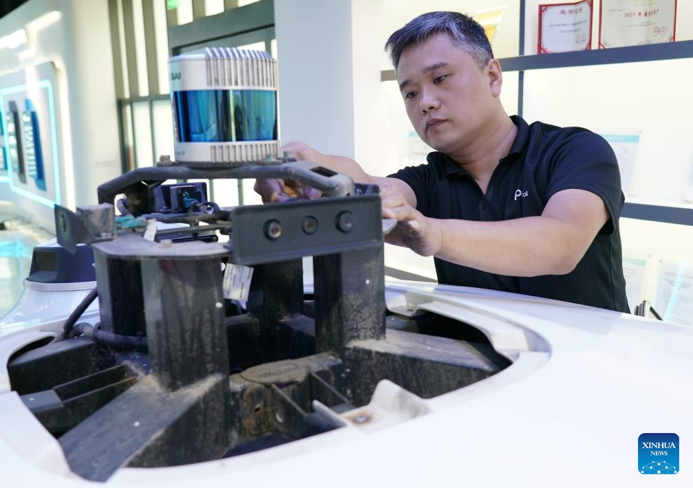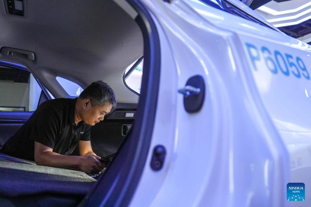 Wang Wei checks the sensor of an autonomous vehicle at the operation center of Pony.ai in Yizhuang in Beijing, capital of China, June 19, 2024.