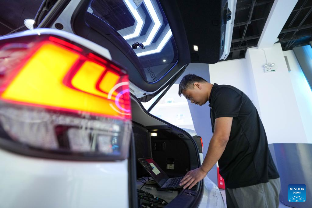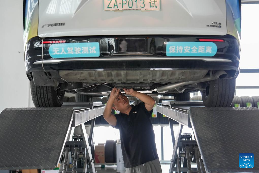 Wang Wei inspects an autonomous vehicle at the operation center of Pony.ai in Yizhuang in Beijing, capital of China, June 19, 2024.