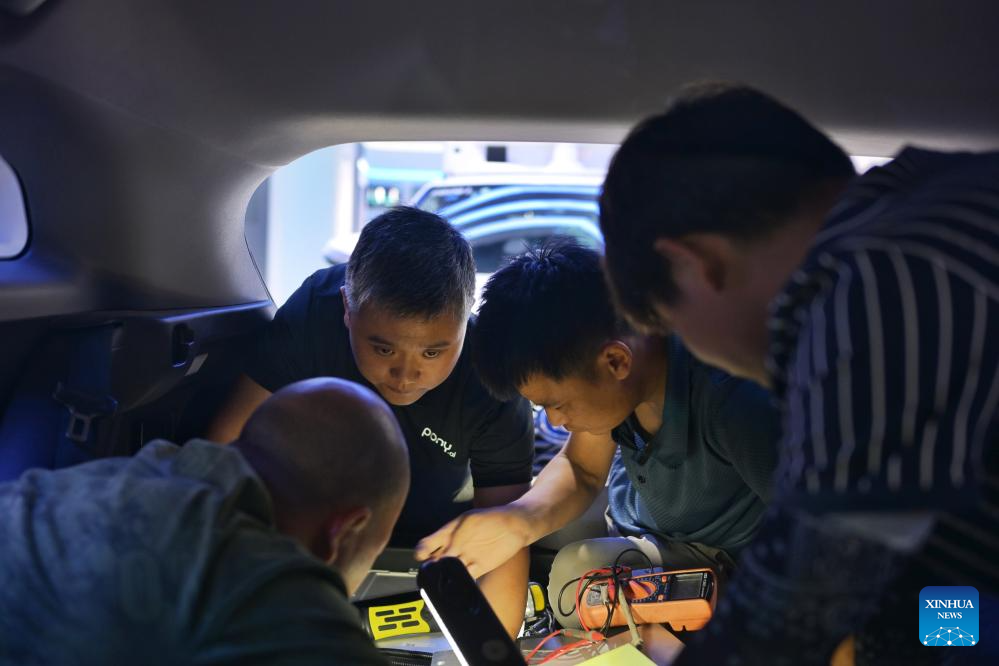 Wang Wei (1st L, rear) and his colleagues check devices in an autonomous vehicle at the operation center of Pony.ai in Yizhuang in Beijing, capital of China, June 19, 2024.