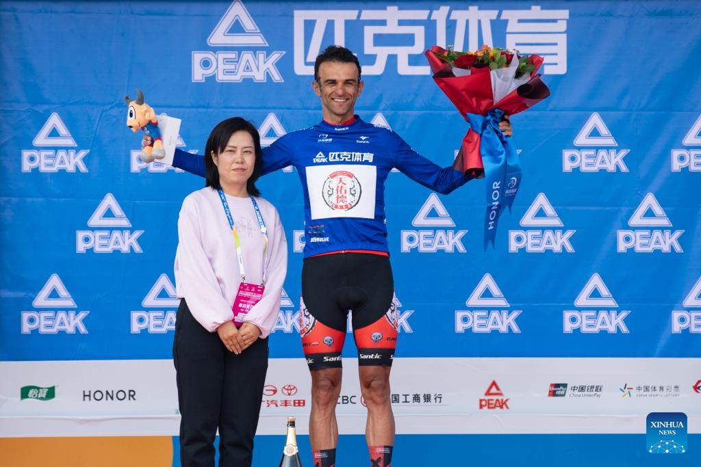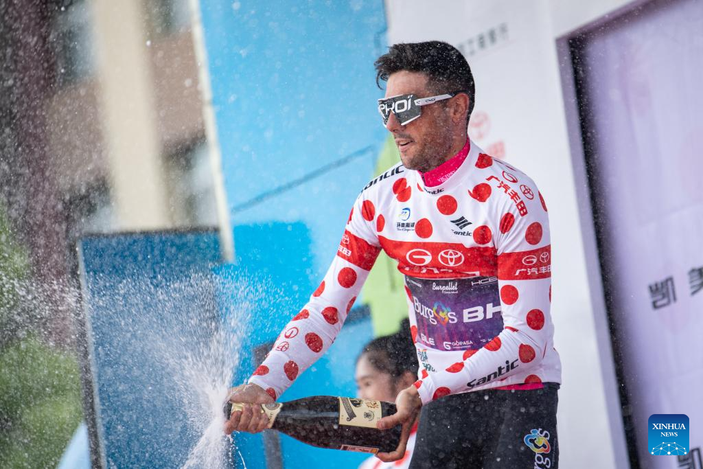 Mario Aparicio Munoz from Spain's Burgos-BH wearing the polka-dot jersey celebrates at the podium after the stage 2 of the 23rd Tour of Qinghai Lake cycling race from Duoba to Huzhu, northwest China's Qinghai Province, July 8, 2023. (Photo by Pan Binbin/Xinhua)