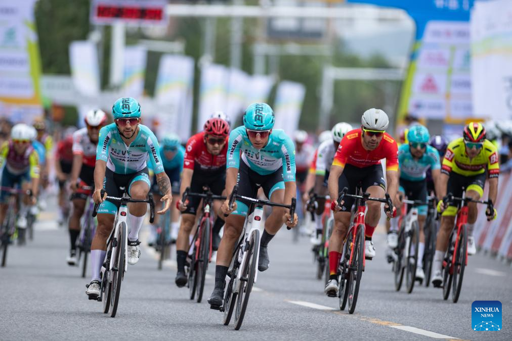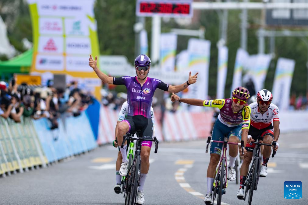 Antonio Eric Fagundez Lima (front L) from Spain's Team Burgos-BH celebrates after crossing the finish line during the stage 2 of the 23rd Tour of Qinghai Lake cycling race from Duoba to Huzhu, northwest China's Qinghai Province, July 8, 2023. (Photo by Pan Binbin/Xinhua)