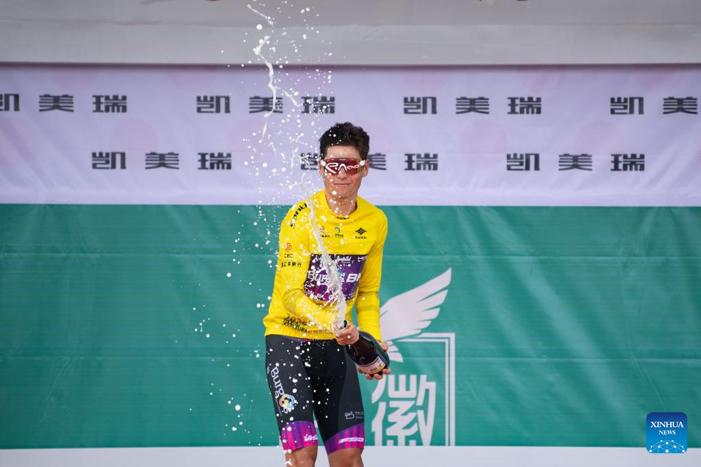 Antonio Eric Fagundez Lima from Spain's Team Burgos BH wearing the yellow jersey celebrates after the stage 2 of the 23rd Tour of Qinghai Lake cycling race from Duoba to Huzhu, northwest China's Qinghai Province, July 8, 2023. (Photo by Pan Binbin/Xinhua)