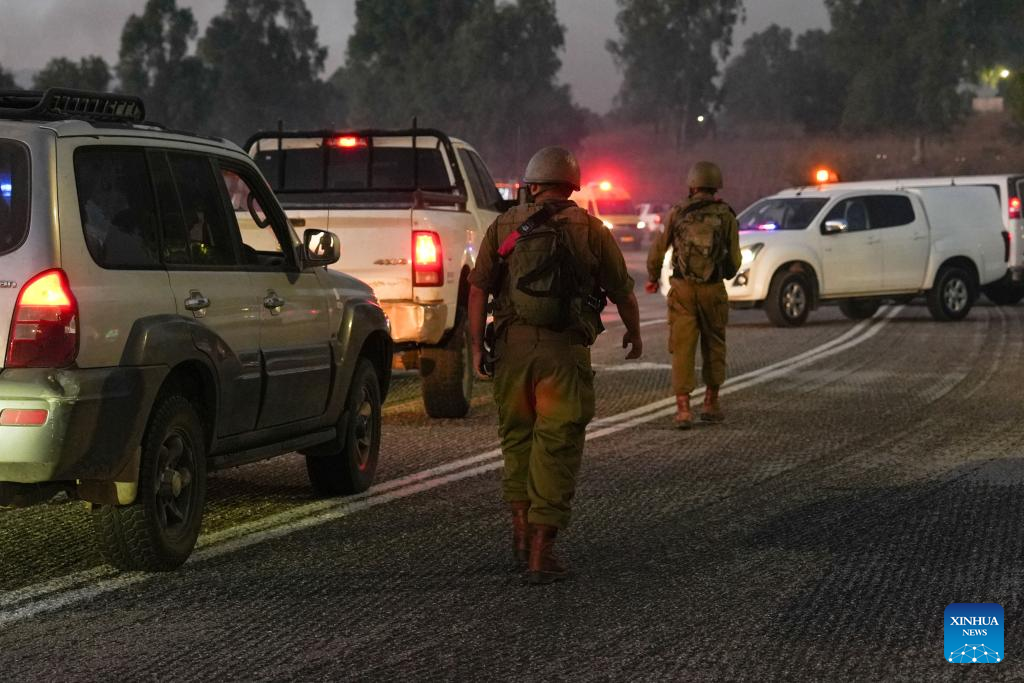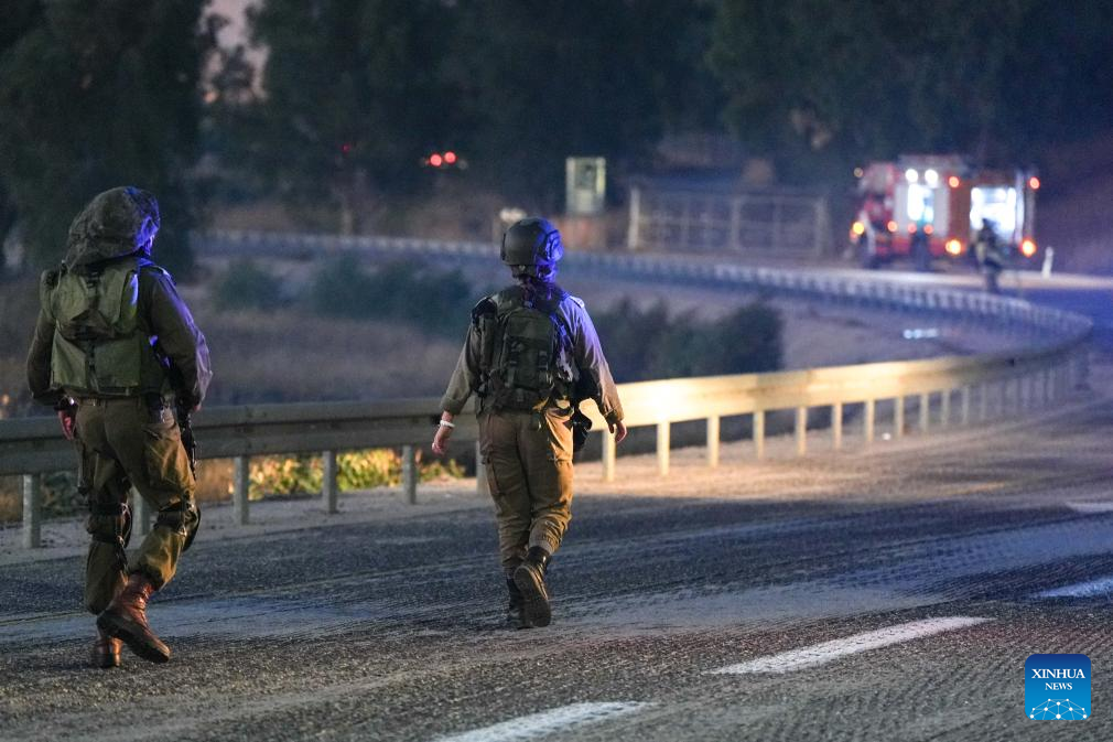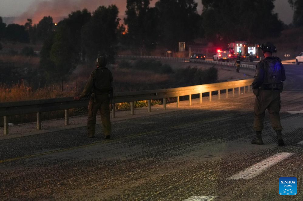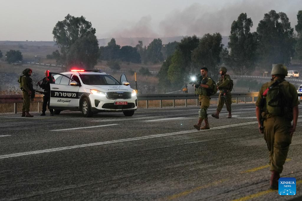 Israeli soldiers are seen near the scene of a rocket attack from Lebanon in the Israeli-occupied Golan Heights, on July 9, 2024. (Ayal Margolin/JINI via Xinhua)