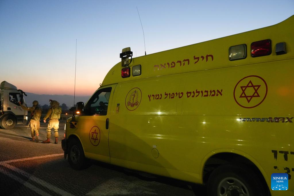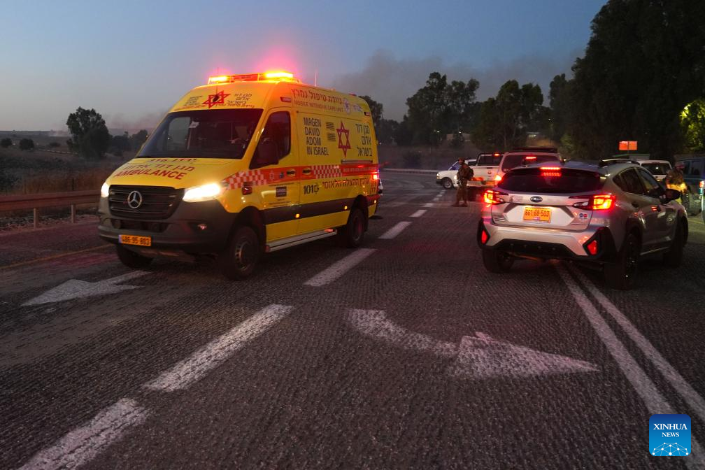 An ambulance is seen near the scene of a rocket attack from Lebanon in the Israeli-occupied Golan Heights, on July 9, 2024. (Ayal Margolin/JINI via Xinhua)