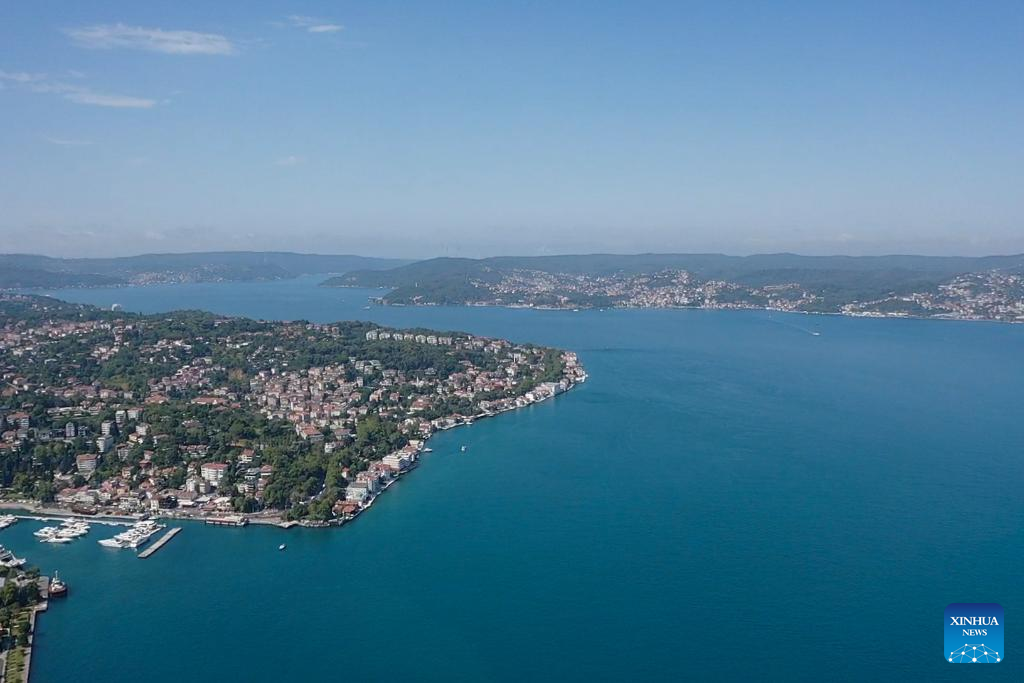A drone photo taken on July 10, 2024 shows the Bosphorus Strait in Istanbul, Türkiye. Ship traffic in Istanbul's Bosphorus Strait has partially resumed following a temporary suspension caused by an engine failure on a ship earlier on Wednesday, according to Türkiye's Directorate General of Coastal Safety. (Xinhua/Liu Lei)
