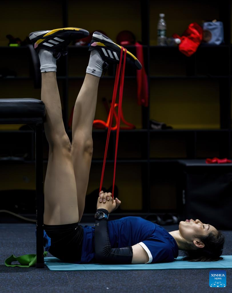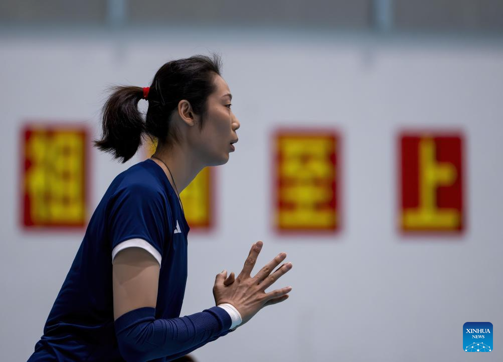 Players of the Chinese national women's volleyball team attend a training session in preparation for the Paris 2024 Olympics in Zhangzhou, southeast China's Fujian Province, July 13, 2024. (Xinhua/Wei Peiquan)