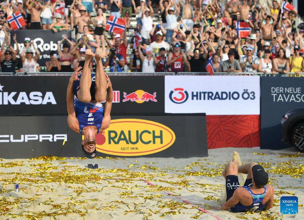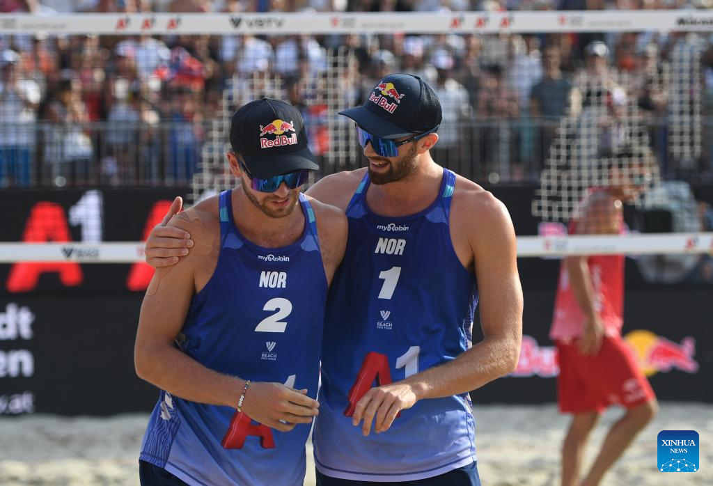 Anders Berntsen Mol (R) and Christian Sandlie Sorum of Norway celebrate victory after the men's final match between Anders Berntsen Mol/Christian Sandlie Sorum of Norway and Michal Bryl/Bartosz Losiak of Poland at the Volleyball World Beach Pro Tour Elite 16 2024 in Vienna, Austria, July 14, 2024. (Xinhua/He Canling)
