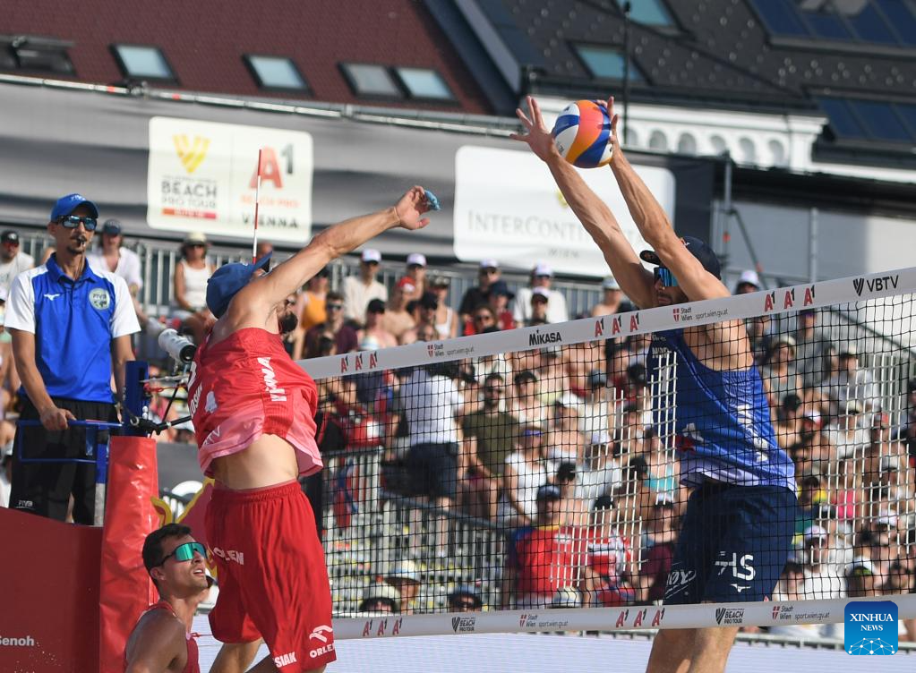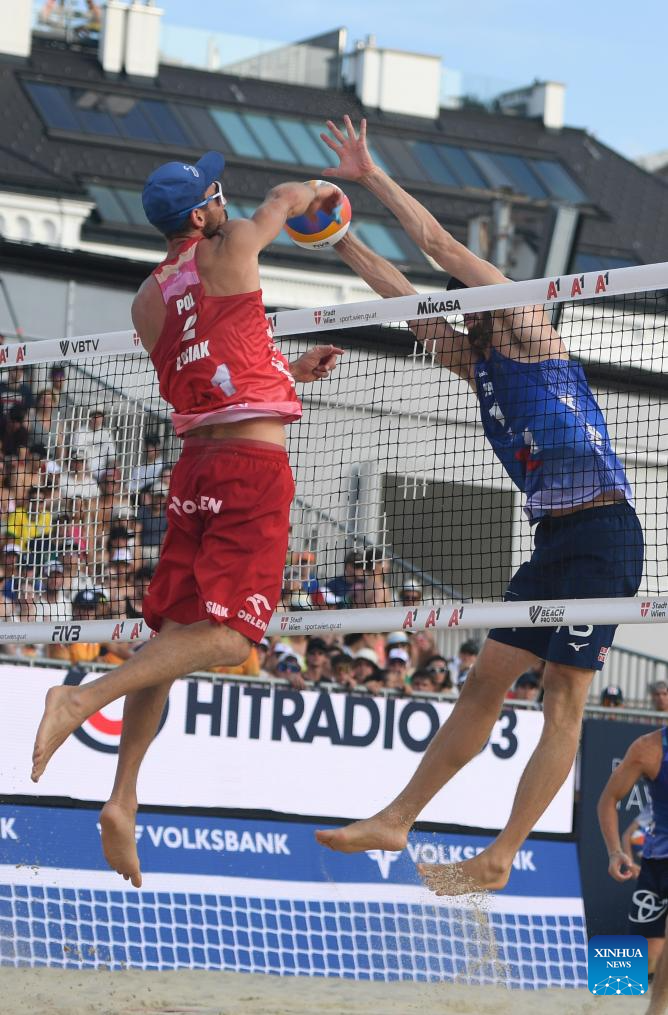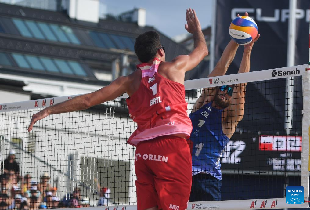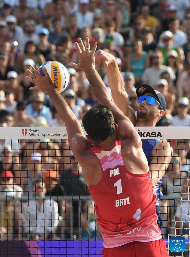 Michal Bryl (R) of Poland spikes the ball during the men's final match between Anders Berntsen Mol/Christian Sandlie Sorum of Norway and Michal Bryl/Bartosz Losiak of Poland at the Volleyball World Beach Pro Tour Elite 16 2024 in Vienna, Austria, July 14, 2024. (Xinhua/He Canling)