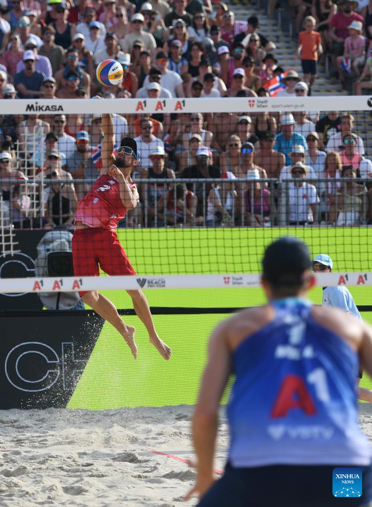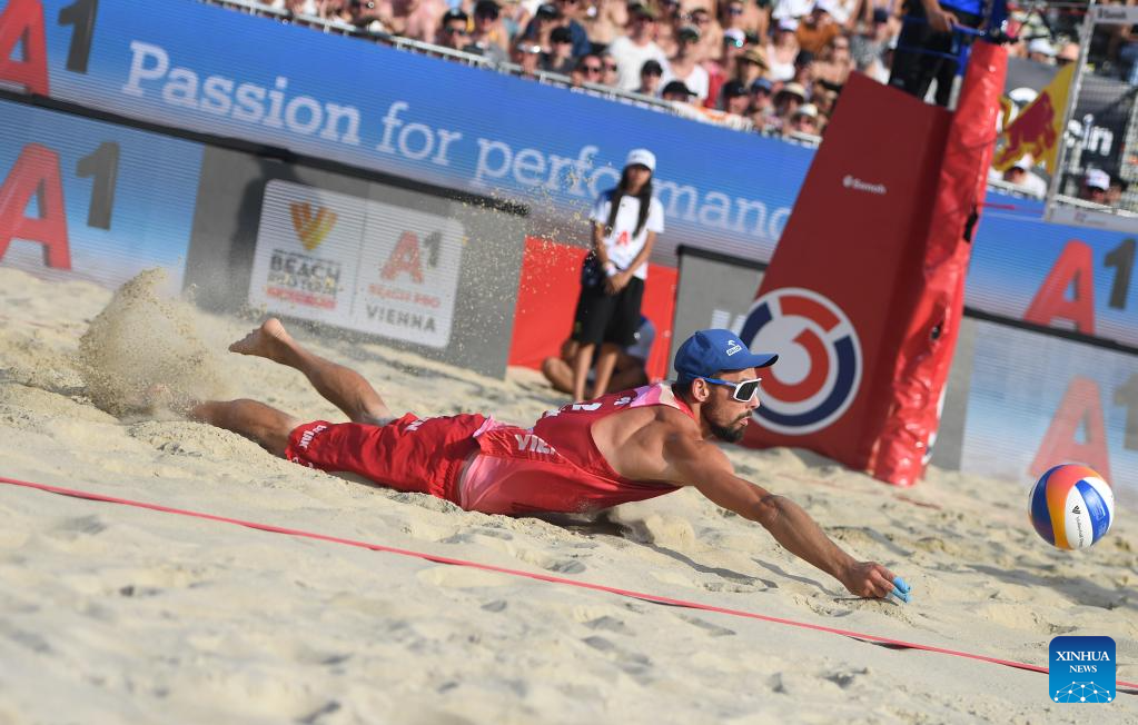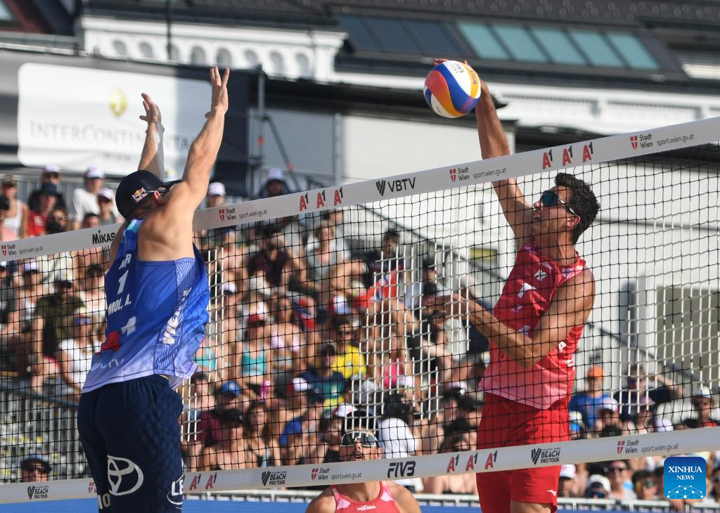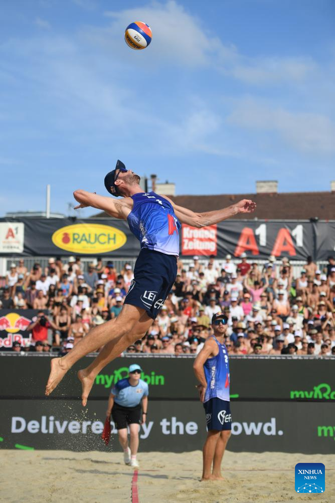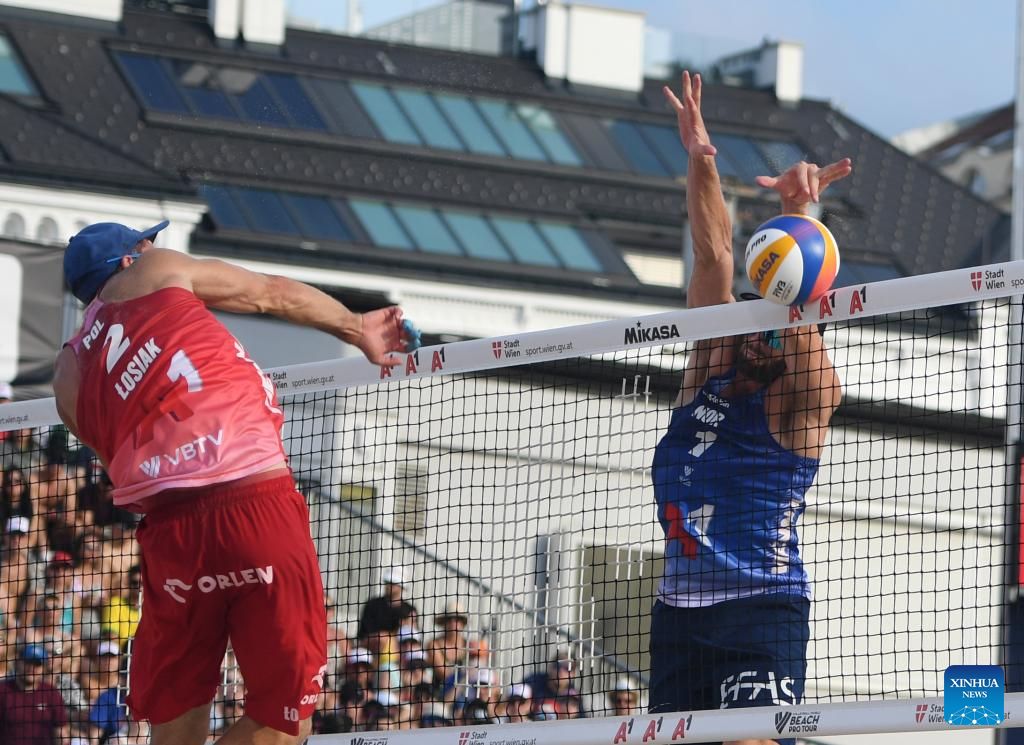 Michal Bryl (R) of Poland spikes the ball during the men's final match between Anders Berntsen Mol/Christian Sandlie Sorum of Norway and Michal Bryl/Bartosz Losiak of Poland at the Volleyball World Beach Pro Tour Elite 16 2024 in Vienna, Austria, July 14, 2024. (Xinhua/He Canling)