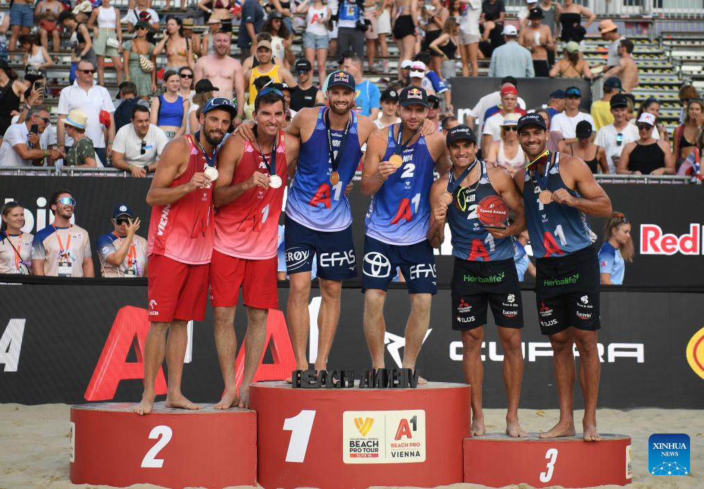 Second-placed Bartosz Losiak/Michal Bryl of Poland, first-placed Anders Berntsen Mol/Christian Sandlie Sorum of Norway and third-placed Esteban Grimalt/Marco Grimalt of Chile (L to R) pose for group photos at awarding ceremony of the Volleyball World Beach Pro Tour Elite 16 2024 in Vienna, Austria, July 14, 2024. (Xinhua/He Canling)