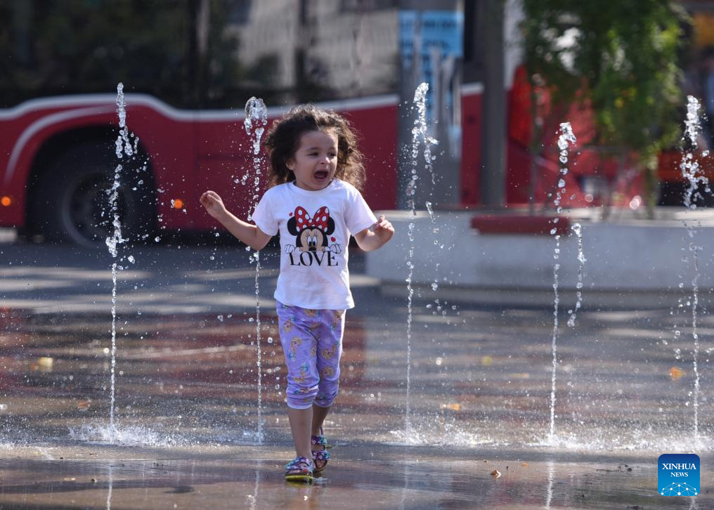 A kid plays at a spray installation in Vienna, Austria, July 16, 2024. (Xinhua/He Canling)
