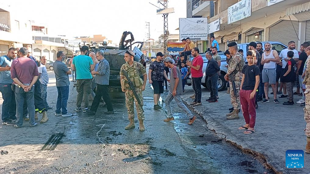 This photo taken with a mobile phone shows members of the Lebanese army and citizens at the site of an Israeli airstrike targeting a car in Ghazzeh, Lebanon, on July 18, 2024. A leader from the Islamic Group was killed on Thursday in an Israeli airstrike on the village of Ghazzeh in the Bekaa region in eastern Lebanon, Lebanese military sources told Xinhua.(Photo by Taher Abu Hamdan/Xinhua)