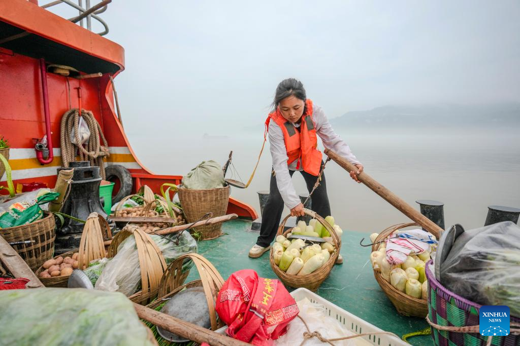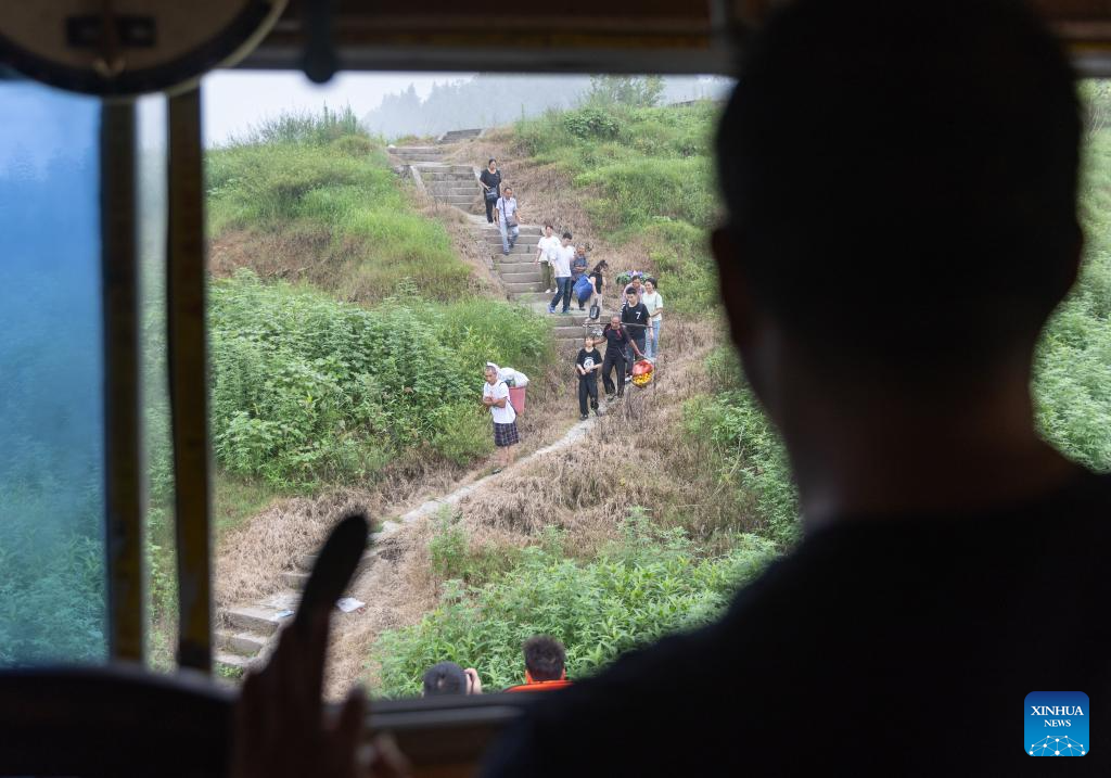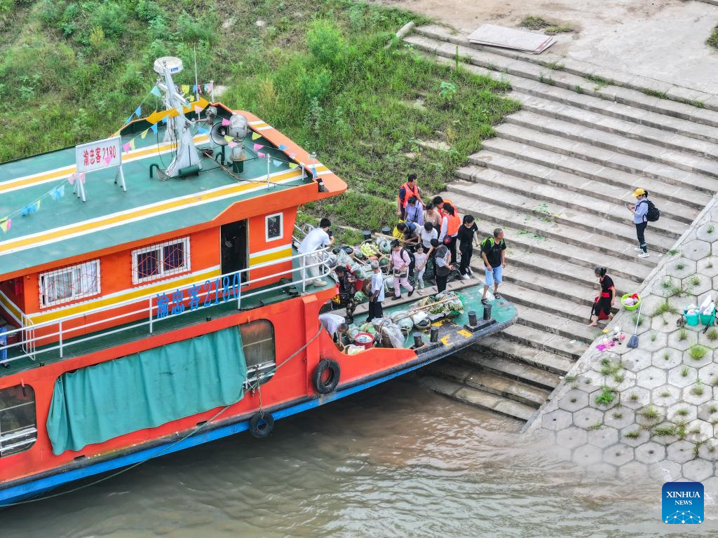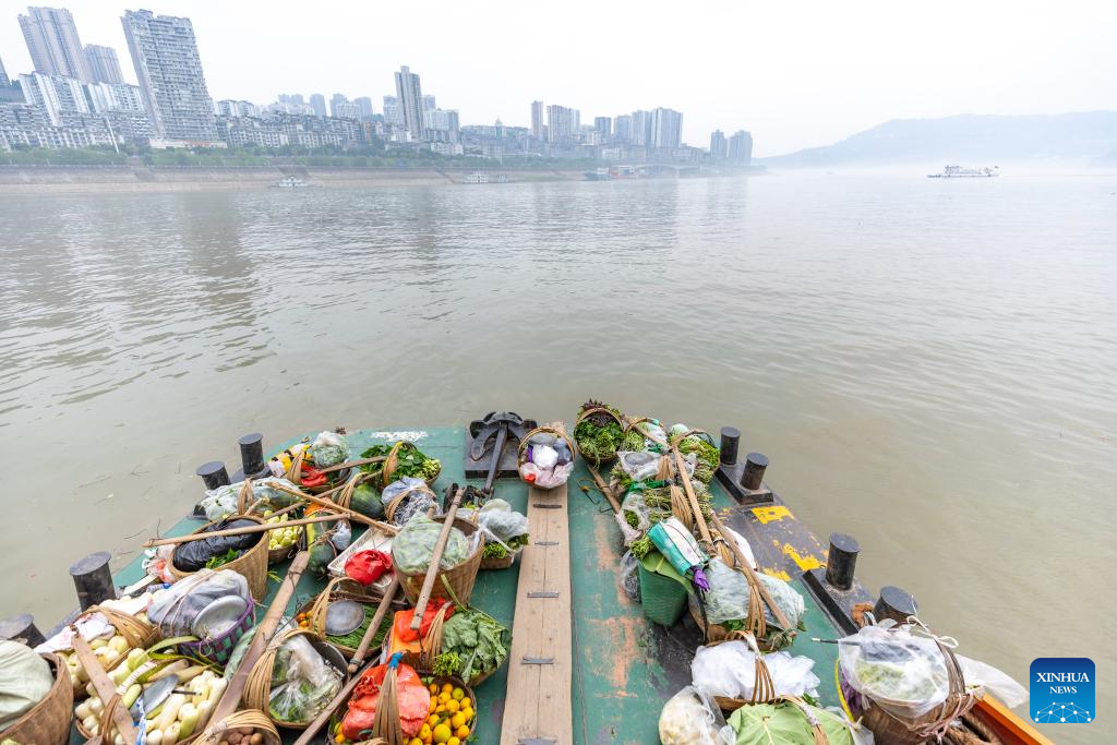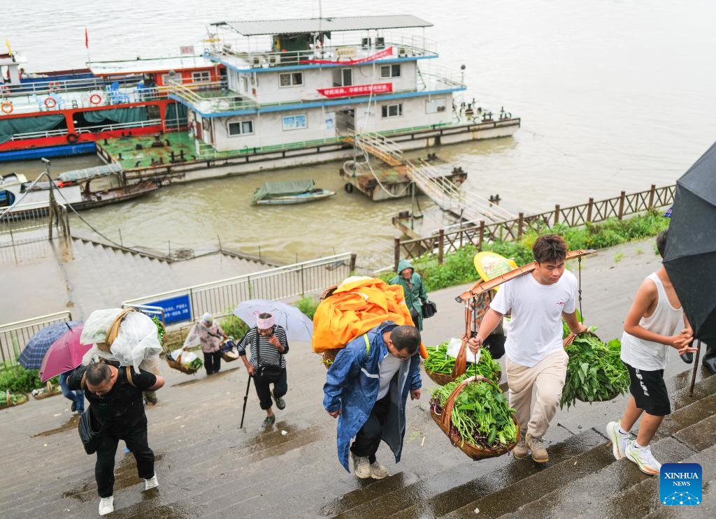 Farmers carrying their produce wait for "Yu Zhong Ke 2180" ferry at a stop of the route in southwest China's Chongqing Municipality, July 10, 2024.