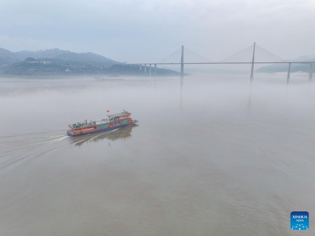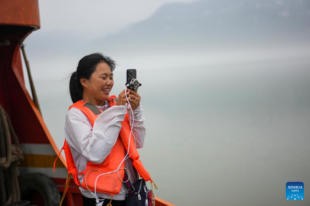 Cao Lifang shows the foggy scenery of Yangtze River to viewers via livestreaming on "Yu Zhong Ke 2180" ferry in southwest China's Chongqing Municipality, July 10, 2024.