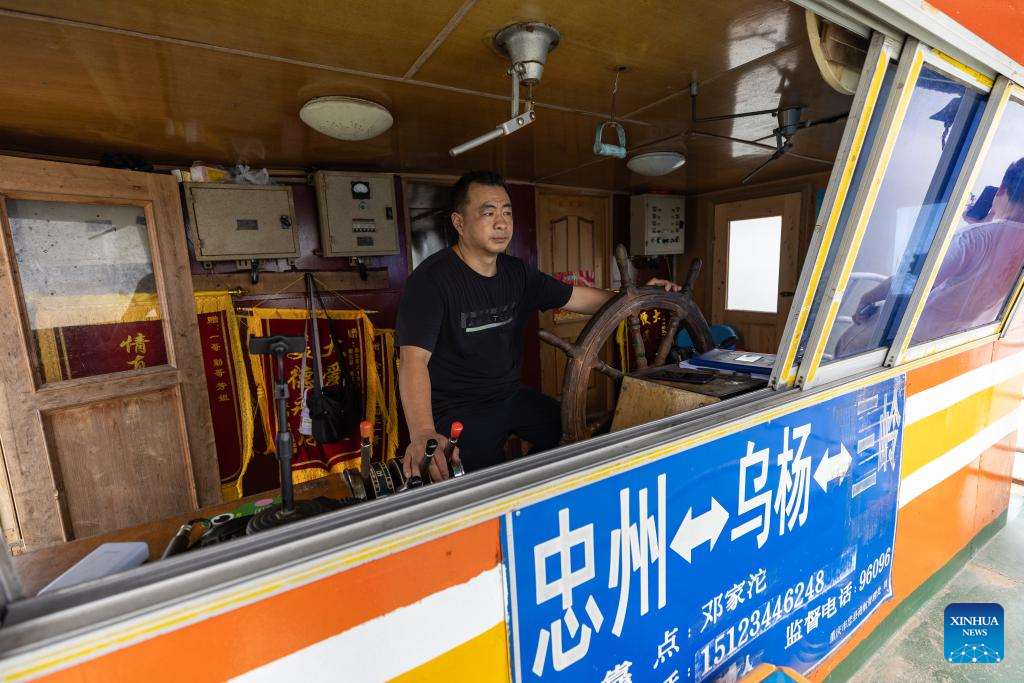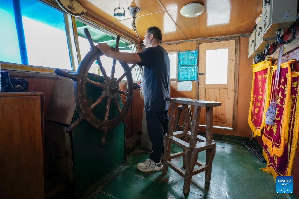Qin Dayi holds the helm on "Yu Zhong Ke 2180" ferry in southwest China's Chongqing Municipality, July 10, 2024.